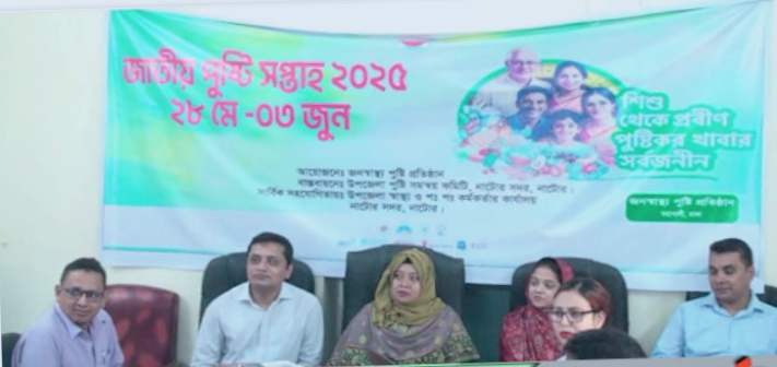 আল আমিন, নাটোর প্রতিনিধি :- “শিশু থেকে প্রবীণ-পুষ্টিকর খাবার সর্বজনীন” এই প্রতিপাদ্য নিয়ে ২৮ মে -০৩ জুন পর্যন্ত নাটোরে জাতীয় পুষ্টি সপ্তাহ পালন করা হয়েছে। এ উপলক্ষ্যে আজ বুধবার বেলা ১১ টার দিকে নাটোর শহরের পশ্চিম কান্দিভিটা উপজেলা স্বাস্থ্য ও পঃ পঃ কর্মকর্তার সামনে থেকে এক রেলী বের করা হয়। রেলিটি প্রধান প্রধান সড়ক প্রদক্ষিন করে উপজেলা স্বাস্থ্য ও পঃপঃ কর্মকর্তার কার্যালয়ে এসে শেষ হয়। পরে সেখানে এক আলোচনা সভা অনুষ্ঠিত হয়। আলোচনা সভায় উপস্থিত ছিলেন নাটোর সদর উপজেলা নির্বাহী কর্মকর্তা আক্তার জাহান সাথী, নাটোর সদর উপজেলা স্বাস্থ্য ও পঃপঃকর্মকর্তা ডাঃ মোহাম্মদ কামাল উদ্দিন ভূইয়া, ডাক্তার সুকন্যা সরকার সহ অন্যান্য কর্মকর্তাবৃন্দ উপস্থিত ছিলেন।