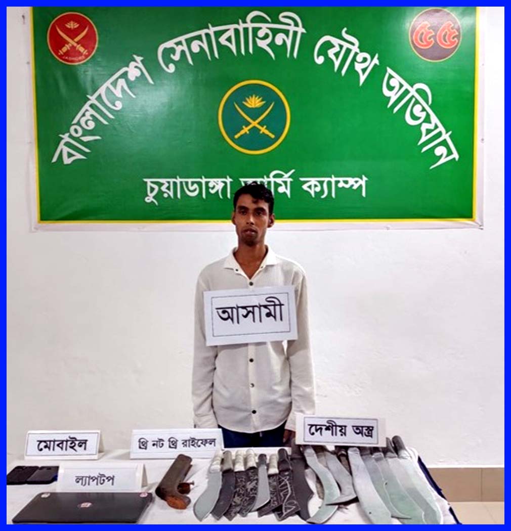 গতকাল বৃহস্পতিবার দুপুরে দিকে চুয়াডাঙ্গা সেনা ক্যাম্প প্রেসবিজ্ঞপ্তিতে জানানো হয়েছে, গোয়েন্দা তথ্যের ভিত্তিতে ক্যাপ্টেন নুসরাত জারিনের নেতৃত্ব সেনাবাহিনী ও পুলিশের যৌথ টিম অস্ত্র উদ্ধারের অভিযানে নামে। ভোর রাত ৪টা থেকে সকাল ৭টা পর্যন্ত চালানো অভিযানের সময় চুয়াডাঙ্গা শহরের গুলশানপাড়ার একটি বাড়ি থেকে নাজমুল আরেফিন কিরণ নামে এক যুবককে আটক করা হয়। এ সময় তার বাড়ির বিভিন্ন স্থান থেকে একটি থ্রি নট থ্রি রাইফেলের বডি (অংশ বিশেষ), ১৮টি দেশীয় অস্ত্র, ৩টি চাপাতি, ৬টি বড় ছুরি, ৩টি রামদা, ৬টি তরবারি, একটি ল্যাপটপ ও ৩টি মোবাইলফোন উদ্ধার করা হয়। বেলা সাড়ে ৩টার দিকে কিরণকে চুয়াডাঙ্গা সদর থানায় হস্তান্তর করা হয়েছে।