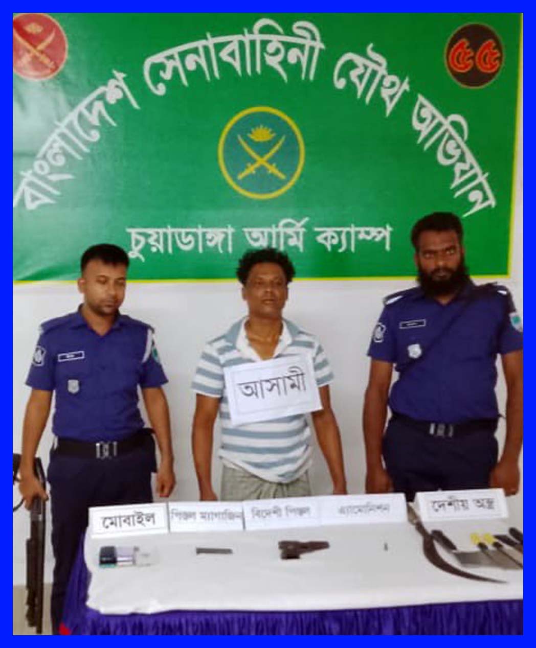স্টাফ রিপোর্টার : চুয়াডাঙ্গায় আগ্নেয়াস্ত্র ও দেশীয় অস্ত্রসহ চুয়াডাঙ্গা পৌর যুবদলের সিনিয়র যুগ্ম-আহ্বায়ক লিমন আলী (৪০) কে গ্রেফতার করেছে সেনাবাহিনী। গতকাল শনিবার ২১ জুন ভোর ৫টার দিকে সেনাবাহিনী লিমনের বাড়িতে অভিযান চালিয়ে গ্রেফতার করে। লিমন আলী চুয়াডাঙ্গা ঝিনাইদহ বাসস্ট্যান্ড পাড়ার এতিমখানা রোডের আবুল হোসেনের ছেলে।