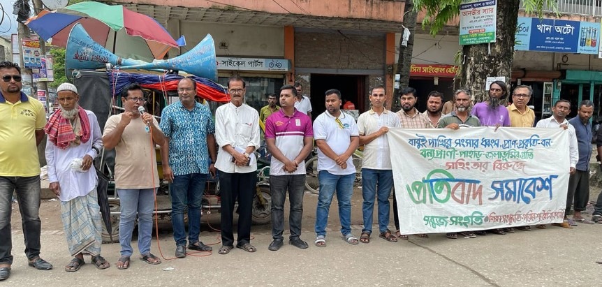 নেত্রকোনা প্রতিনিধি:- বাবুই পাখির সংসার ধ্বংস-প্রাণ-প্রকৃতি, বন-বন্যপ্রাণী-পাহাড়-জলাভূমির প্রতি সহিংসতার বিরুদ্ধে নেত্রকোনার পরিবেশবাদী সংগঠনগুলো প্রতিবাদ সমাবেশ কর্মসূচী পালন করেছে। আজ বৃহস্পতিবার (০৩ জুলাই) দুপুরে নেত্রকোনা জেলা শহরের মোক্তারপাড়া পৌরসভার সামনের সড়কে ঘণ্টাব্যাপী সমাবেশের আয়োজন করেছে সবুজ সংহতি এবং শিক্ষা সংস্কৃতি পরিবেশ ও বৈচিত্র্যরক্ষা কমিটি। বারসিকের সহযোগিতায় প্রতিবাদ সমাবেশে বিভিন্ন পরিবেশবাদী সংগঠনসহ সামাজিক সংগঠনের নেতৃবৃন্দরা একাত্মতা প্রকাশ করে অংশ নেয়।