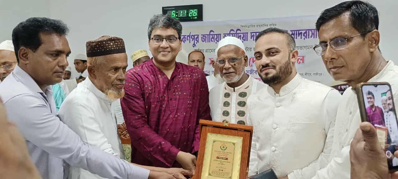 গাজীপুর প্রতিনিধি :- গাজীপুরের শ্রীপুরে কর্নপুর জামিয়া হামিদিয়া দারুল উলুম মাদরাসা ও এতিমখানার উদ্যোগে আকন্দ ফাউন্ডেশনের প্রতিষ্ঠাতা, যুক্তরাজ্য প্রবাসী ও শ্রীপুরের কৃতিসন্তান ব্যারিস্টার জাহিদ হাসান আকন্দকে সংবর্ধনা প্রদান করা হয়েছে। শনিবার (৫ জুলাই) বাদ আসর মাদরাসা অডিটরিয়ামে এ সংবর্ধনা ও দোয়া মাহফিল অনুষ্ঠিত হয়। অনুষ্ঠানে সভাপতিত্ব করেন গোসিঙ্গা ইউনিয়নের সাবেক চেয়ারম্যান মীর মো. নুরে আব্দুল হাই। এতে প্রধান অতিথি হিসেবে উপস্থিত ছিলেন শ্রীপুর উপজেলা নির্বাহী কর্মকর্তা (ইউএনও) ব্যারিস্টার সজিব আহমেদ। বিশেষ অতিথি হিসেবে উপস্থিত ছিলেন শ্রীপুর উপজেলা বিএনপির আহ্বায়ক আব্দুল মোতালেব, আকন্দ ফাউন্ডেশনের চেয়ারম্যান লুৎফর রহমান আকন্দসহ স্থানীয় গণ্যমান্য ব্যক্তিবর্গ। অনুষ্ঠানে মাদরাসা কর্তৃপক্ষ ব্যারিস্টার জাহিদ হাসান আকন্দ ও ইউএনও ব্যারিস্টার সজিব আহমেদকে সম্মাননা স্মারক তুলে দেন। ব্যারিস্টার জাহিদ হাসান আকন্দ সুবিধাবঞ্চিত ও অসহায় মানুষের পাশে দাঁড়ানোর লক্ষ্যে ‘আকন্দ ফাউন্ডেশন’ প্রতিষ্ঠা করেন। তিনি ২০২৪ সালের জুলাই-আগস্টে আওয়ামী লীগ সরকারের পদত্যাগ দাবিতে চলমান আন্দোলনে যুক্তরাজ্যে অবস্থান করে প্রবাসীদের ঐক্যবদ্ধ করার মাধ্যমে আন্দোলনে ভূমিকা রাখেন।