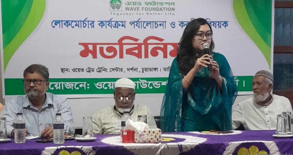 মাহমুদ হাসান রনি,চুয়াডাঙ্গা প্রতিনিধি:- চুয়াডাঙ্গার দর্শনায় ওয়েভ ফাউন্ডেশন ও লোকমোর্চার আয়োজনে ‘লোকমোর্চার কার্যক্রম পর্যালোচনা ও করণীয় বিষয়ক’ মতবিনিময় ও আলোচনা সভা অনুষ্ঠিত হয়েছে। মঙ্গলবার বিকাল সাড়ে ৪ টায় দর্শনায় সংস্থার ওয়েভ ট্রেড ট্রেনিং সেন্টারে এ মতবিনিময় সভার সভাপতিত্ব করেন দর্শনা থানা লোকমোর্চার সভাপতি প্রফেসার আজিজুর রহমান। প্রধান অতিথি হিসেবে উপস্থিত ছিলেন ওয়েভ ফাউন্ডেশনের নির্বাহী উপপরিচালক নাফিসা আলী সূচনা।