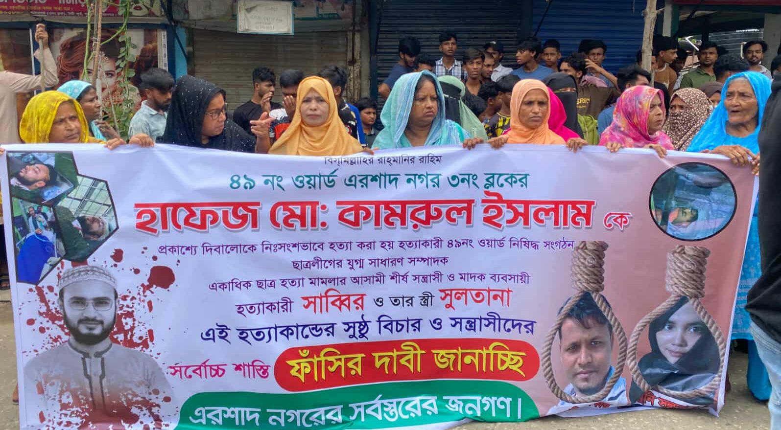 মানববন্ধনে বক্তারা বলেন, এরশাদ নগর ৩ নম্বর ব্লকের নিহত হাফেজ মো. কামরুলের হত্যাকারী, ছাত্র হত্যা মামলার আসামী শীর্ষ সন্ত্রাসী সাব্বির ও তার স্ত্রী সুলতানাকে পুলিশ গ্রেফতার করেছে। আমরা এলাকাবাসী এর সুষ্ঠু তদন্ত ও দ্রুত ফাঁসির কার্যকর দাবি জানাচ্ছি ।