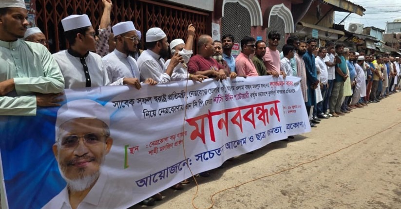 বাবরকে নিয়ে এনসিপি নেতার কটূক্তির প্রতিবাদে নেত্রকোণায় আলেম ছাত্র-জনতার মানববন্ধন