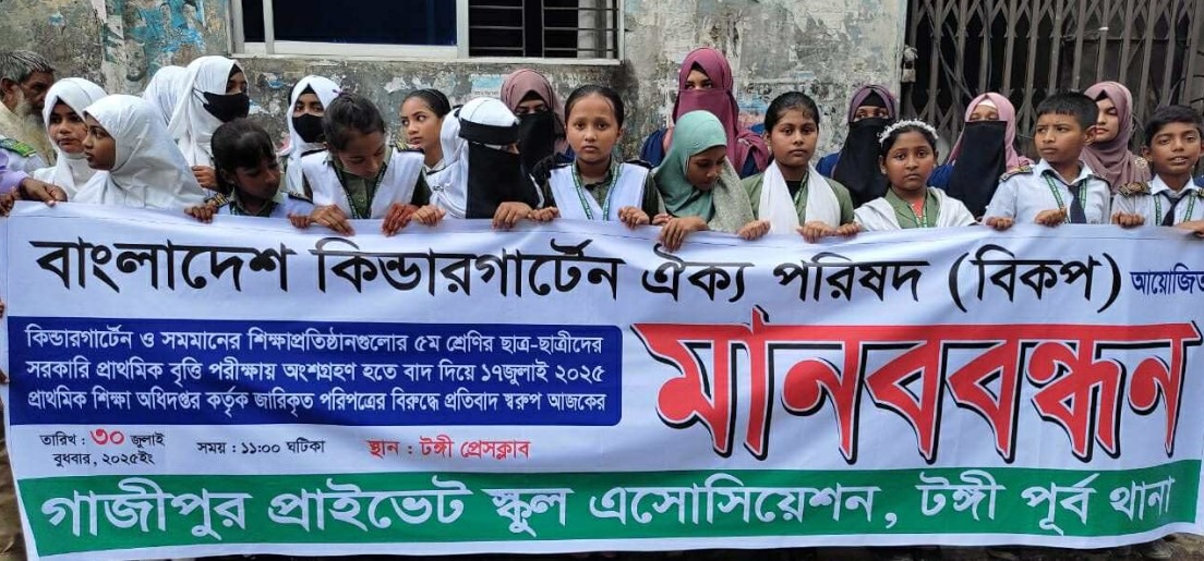 শফিকুল ইসলাম শিমুল, গাজীপুর মহানগর প্রতিনিধি:- টঙ্গীতে কিন্ডারগার্টেন ও সমমানের শিক্ষা প্রতিষ্ঠানের বৃত্তি প্রদানের দাবিতে মানববন্ধন টঙ্গীতে কিন্ডারগার্টেন ও সমমানের শিক্ষা প্রতিষ্ঠানের বৃত্তি প্রদানের দাবিতে মানববন্ধন কিন্ডারগার্টেন ও সমমানের শিক্ষা প্রতিষ্ঠান গুলোর পঞ্চম শ্রেণির ছাত্র-ছাত্রীদের সরকারি প্রাথমিক বৃত্তি পরীক্ষার সুযোগ প্রদানের দাবিতে টঙ্গীতে মানববন্ধন কর্মসূচি পালন করেছে টঙ্গী পূর্ব ও পশ্চিম থানার দুই শতাধিক কিন্ডারগার্টেন ও সমমানের স্কুলের শিক্ষক ও শিক্ষার্থীরা। বুধবার (৩০ জুলাই) দুপুর টঙ্গী প্রেসক্লাবের সামনে ঢাকা ময়মনসিংহ মহাসড়কের পশ্চিম পাশ্বে এ মানববন্ধন কর্মসূচি অনুষ্ঠিত হয়। বাংলাদেশ কিন্ডারগার্টেন ঐক্য পরিষদ (বিকপ) ঘোষিত কর্মসূচির অংশ হিসেব আজ বুধবার সকালে গাজীপুর প্রাইভেট স্কুল এসোসিয়েশন টঙ্গী পূর্ব ও পশ্চিম থানার আয়োজনে এই মানববন্ধন কর্মসূচি পালন করা হয়। স্কুলগুলোর শত শত শিক্ষক-শিক্ষিকা ও কয়েক হাজার কোমলমতি শিক্ষার্থী পঞ্চম শ্রেণির সরকারি প্রাথমিক বৃত্তির সুযোগ দানের দাবি সম্বলিত ব্যানার ও ফেস্টুন নিয়ে মানববন্ধনে অংশগ্রহণ করে। এ সময় টঙ্গী প্রেসক্লাবের সামনে গাজীপুর প্রাইভেট স্কুল এসোসিয়েশন টঙ্গী পূর্ব থানার সভাপতি আলহাজ্ব মোঃ আব্দুল মতিনের সভাপতিত্বে বক্তব্য রাখেন টঙ্গী পশ্চিম থানা বিএনপির আহ্বায়ক প্রভাষক বসির উদ্দিন, সংগঠনের পশ্চিম থানা সভাপতি মুহাম্মদ হেদায়েত উল্লাহ, সাধারণ সম্পাদক আলহাজ্ব মোঃ মজিবুর রহমান, সাংগঠনিক সম্পাদক সাইদুল ইসলাম জনি, পূর্ব থানার সাধারণ সম্পাদক শাহাবুদ্দিন হাওলাদার, অর্থ সম্পাদক সোহেল ভূঁইয়া প্রমুখ। এ সময় বক্তারা বলেন, প্রাথমিক শিক্ষায় সরকারি প্রাথমিক বিদ্যালয়ের পাশাপাশি কিন্ডারগার্টেন ও বেসরকারি শিক্ষা প্রতিষ্ঠানগুলো যুগান্তকারী ভূমিকা পালন করে চলছে। দেশের বেকার সমস্যা দূরীকরণে প্রতিষ্ঠানগুলোর ভূমিকা অপরিসীম। কিন্তু হঠাৎ করে প্রাথমিক শিক্ষা অধিদপ্তর গত ১৭ জুলাই কিন্ডারগার্টেন ও বেসরকারি শিক্ষা প্রতিষ্ঠানের শিক্ষার্থীকে বৃত্তি পরীক্ষার সুযোগ থেকে বঞ্চিত করে শুধুমাত্র সরকারি স্কুলের শিক্ষার্থীদের প্রাথমিক বৃত্তির ঘোষণা দিয়ে একটি বিতর্কিত পরিপত্র প্রকাশ করে। যা বৈষম্যবিরোধী আন্দোলনের মাধ্যমে জুলাই গণঅভ্যুত্থান পরবর্তী বাংলাদেশে নতুন করে কোমলমতি শিক্ষার্থীদের সঙ্গে চরম বৈষম্যমূলক আচরণের দৃষ্টান্ত স্থাপন করেছে। বক্তারা আরো বলেন, ২০০৯ থেকে ২০১৯ সাল পর্যন্ত অনুষ্ঠিত প্রাথমিক সমাপনী পরীক্ষা ও ২০২২ সালে অনুষ্ঠিত বৃত্তি পরীক্ষায় অংশগ্রহণের মাধ্যমে কিন্ডারগার্টেন ও বেসরকারি শিক্ষা প্রতিষ্ঠানের শিক্ষার্থীরা ব্য
