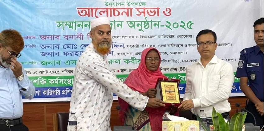 নেত্রকোনা প্রতিনিধি :- ‘প্রবাসীর অধিকার, আমাদের অঙ্গীকার- বৈষম্যহীন বাংলাদেশ আমাদের সবার’—এই প্রতিপাদ্যে নেত্রকোনায় পালিত হলো ‘রেমিট্যান্স যোদ্ধা দিবস’। ছাত্র-জনতার ঐতিহাসিক জুলাই গণ-অভ্যুত্থান স্মরণে আয়োজিত এ অনুষ্ঠানে আলোচনা সভা ও সর্বোচ্চ রেমিট্যান্স পাঠানো প্রবাসীদের সম্মাননা প্রদান করা হয়। আজ শনিবার (২ আগস্ট) দুপুরে নেত্রকোনা কারিগরি প্রশিক্ষণ কেন্দ্র (টিটিসি) ক্যাম্পাসের হলরুমে এই আয়োজন করে জেলা কর্মসংস্থান ও জনশক্তি অফিস এবং প্রবাসী কল্যাণ ব্যাংক। টিটিসির ভারপ্রাপ্ত অধ্যক্ষ এস. এম. ছাদরুল কবীরের সভাপতিত্বে অনুষ্ঠানে প্রধান অতিথি হিসেবে উপস্থিত ছিলেন স্থানীয় সরকারের উপ-পরিচালক (ডিডি-এলজি) মো. আরিফুল ইসলাম সরদার। অনুষ্ঠানে গত এক বছরে দেশে সর্বোচ্চ রেমিট্যান্স পাঠানো দুই প্রবাসীকে সম্মাননা দেওয়া হয়। তাঁদের পক্ষে পরিবারের সদস্যরা ক্রেস্ট গ্রহণ করেন।