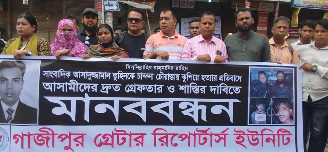 গাজীপুরে সাংবাদিক আসাদুজ্জামান তুহিন হত্যার প্রতিবাদে মানববন্ধন