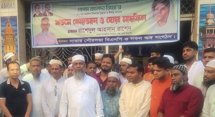সাভার প্রতিনিধি:- ঢাকার সাভারে বিএনপি চেয়ারপার্সন ও সাবেক প্রধানমন্ত্রী বেগম খালেদা জিয়ার ৮০তম জন্মবার্ষিকী উপলক্ষে তার সুস্থতা, দীর্ঘায়ু ও আরোগ্য কামনায় মিলাদ ও দোয়া মাহফিল অনুষ্ঠিত হয়েছে। আজ শনিবার (১৬ আগস্ট) সাভার পৌর এলাকার কাতলাপুর জামে মসজিদে এ মিলাদ ও দোয়া মাহফিলের আয়োজন করে স্থানীয় বিএনপি। অনুষ্ঠানে প্রধান অতিথি হিসেবে উপস্থিত ছিলেন ঢাকা জেলা বিএনপির সাবেক সাংগঠনিক সম্পাদক রাশেদুল আহসান রাশেদ। এছাড়া সাভার থানা বিএনপির যুগ্ম সাধারণ সম্পাদক মো. মিজানুর রহমান মিজানসহ শতাধিক নেতাকর্মী উপস্থিত ছিলেন।