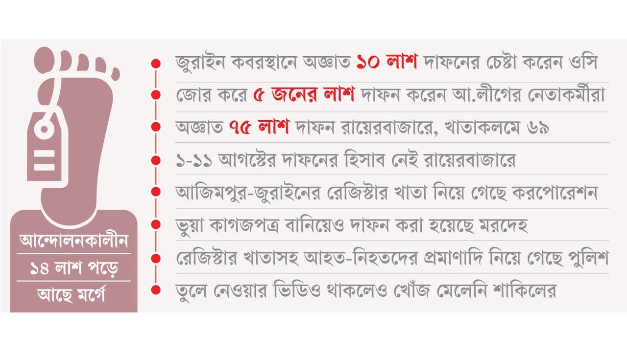 আবার সংঘর্ষের সময় গুলিতে মারা গেলেও অনেক মরদেহ হাসপাতাল থেকে বের করতে দেননি আওয়ামী লীগ নেতাকর্মীরা। মৃত্যুসনদে তরুণ হলে হৃদরোগ আর বয়স্ক হলে বার্ধক্যজনিত কারণে মৃত্যু লিখতে হয়েছে। যে কারণে হাসপাতালগুলোর কাছেও নেই সঠিক তালিকা। হাসপাতাল, আইনশৃঙ্খলা রক্ষাকারী বাহিনী এবং অজ্ঞাত মরদেহ দাফনে কাজ করা আঞ্জুমান মুফিদুলের হিসাবে রয়েছে বিস্তর গরমিল। আবার কবরস্থানের নেই সিসি ক্যামেরা, মরদেহ দাফনের রেজিস্টার খাতা নিয়ে গেছে সিটি করপোরেশন, হাসপাতাল থেকেও মরদেহের পাশাপাশি আহতদেরও রেজিস্টার খাতা জোর করে নিয়ে গেছে পুলিশ। ফলে, হাসপাতাল কর্তৃপক্ষও সঠিক তথ্য দিতে পারছে না।