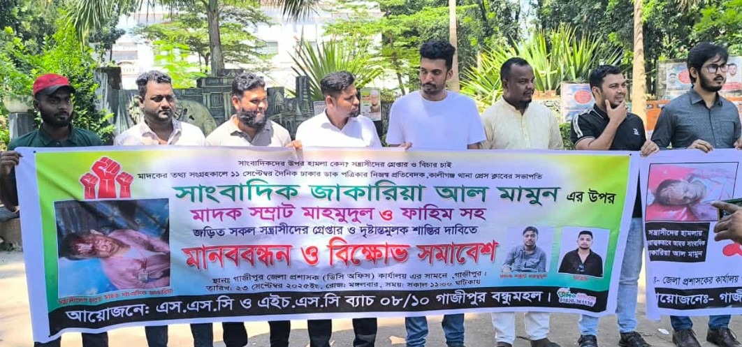গাজীপুর প্রতিনিধি : গাজীপুরে কালিগঞ্জ সাংবাদিক জাকারিয়া আল মামুনের উপর মাদক ব্যবসায়ী ও সন্ত্রাসীদের হামলার প্রতিবাদে জেলা প্রশাসক কার্যালয়ের সামনে মানববন্ধন কর্মসূচী অনুষ্ঠিত হয়েছে। মঙ্গলবার (২৩ই সেপ্টেম্বর) দুপুরে গাজীপুর জেলা প্রশাসক কার্যালয়ের প্রধান ফটকের সামনে এসএসসি ও এইচএসসি ২০০৮/১০ ব্যাচের বন্ধু মহলের ব্যানারে এ কর্মসূচী পালন করা হয়।মানববন্ধনে বিভিন্ন ইলেট্রনিক ও প্রিন্ট মিডিয়ার সাংবাদিক, বন্ধু মহল এবং সুশীল সমাজের গণ্যমান্য ব্যাক্তিবর্গ অংশগ্রহণ করেন। এসময় তারা সাংবাদিকের উপর হামলায় দোষীদের গ্রেফতার ও দ্রুত বিচারের দাবি জানান। উল্লেখ্য বিগত ১১ই সেপ্টেম্বর বৃহস্পতিবার সন্ধ্যায় কালিগঞ্জ জামালপুর বাজার এলাকায় দৈনিক ঢাকার ঢাক পত্রিকার গাজীপুর জেলা প্রতিনিধি সাংবাদিক জাকারিয়া আল মামুনের উপর মাদক ব্যবসায়ী ও সন্ত্রাসী হামলার ঘটনা ঘটে। এতে সাংবাদিক মামুন গুরুতরভাবে আহত হন। বর্তমানে তিনি গাজীপুর শহীদ তাজউদ্দিন আহমদ মেডিকেল কলেজ হাসপাতালে মুমূর্ষু অবস্থায় চিকিৎসাধীন রয়েছেন। এবিষয়ে গত ১৫ই সেপ্টেম্বর সোমবার কালিগঞ্জ থানায় সাংবাদিক জাকারিয়া আল মামুন এর স্ত্রী শান্তা ইসলাম ৫ (পাঁচ) জনের নাম উল্লেখ করে থানায় একটি অভিযোগ দায়ের করেন। পরবর্তিতে পুলিশ একজনকে গ্রেফতার করে। এ ঘটনায় গাজীপুর জেলা এবং কালীগঞ্জ উপজেলায় কর্মরত বিভিন্ন প্রিন্ট ও ইলেকট্রনিক মিডিয়ার সাংবাদিক এবং সাংবাদিকগুলো গভীর উদ্যেগ ও তীব্র নিন্দা জানিয়েছেন।