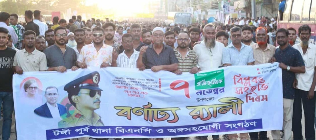 হানিফ পাঠান, গাজীপুর :​- ঐতিহাসিক ৭ নভেম্বর ‘জাতীয় বিপ্লব ও সংহতি দিবস’ উপলক্ষে গাজীপুরে বিএনপি এবং এর সহযোগী সংগঠনের নেতাকর্মীরা বিশাল এক মিছিল নিয়ে রাজপথে নেমে আসে। গাজীপুর ৬ আসনের এমপি পদপ্রার্থী সরকার জাবেদ আহমেদ সুমনের পক্ষে এই কর্মসূচিতে অংশ নেয় টঙ্গী হাজীর মাজার বস্তির ইউনিট বিএনপির নেতা সিদ্দিকুর রহমান ডুবলি, যার উদ্যোগে বস্তির নেতাকর্মীদের স্বতঃস্ফূর্ত অংশগ্রহণ ছিল চোখে পড়ার মতো। এসময় আরো উপস্থিত ছিলেন,আশারফ আলী, মাসুদ রানা ও আতিকুর রহমান, ডি এম সহ আরো অনেকে। ​৭ নভেম্বরকে কেন্দ্র করে স্লোগানে স্লোগানে মুখরিত হয় জয়দেবপুরের রাজপথ। উদ্দীপনা ও সংহতির বার্তা নিয়ে মিছিলটি গাজীপুরের শিববাড়ী মোড় এলাকা থেকে শুরু হয় এবং জয়দেবপুরের বিভিন্ন গুরুত্বপূর্ণ সড়ক প্রদক্ষিণ করে। ​বিপ্লব ও সংহতি দিবসের তাৎপর্য তুলে ধরে স্লোগান দিতে দিতে নেতাকর্মীরা যখন গাজীপুর জেলা প্রেসক্লাবের সামনে গিয়ে মিছিল শেষ করে, তখন এক সংক্ষিপ্ত সমাবেশ অনুষ্ঠিত হয়। ৭ নভেম্বরের সিপাহী-জনতার বিপ্লবের চেতনায় ঐক্যবদ্ধ থাকার আহ্বান জানান এবং গণতন্ত্র পুনরুদ্ধার আন্দোলনে সকল নেতাকর্মীকে ঝাঁপিয়ে পড়ার তাগিদ দেন। ​বিশেষ করে, সরকার জাবেদ আহমেদ সুমনের পক্ষে এবং সিদ্দিকুর রহমান ডুবলির নেতৃত্বে টঙ্গী হাজীর মাজার বস্তির ঐক্যবদ্ধ বিএনপি ও অঙ্গ সহযোগী সংগঠনের নেতাকর্মীরা বিশাল মিছিল নিয়ে অংশগ্রহণ করে সরকার জাবেদ আহমেদ সুমনের পক্ষে ধানের শীষের স্লোগান দিতে দেখা যায়।