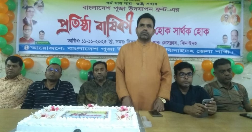 মোঃ ফজলুল কবির গামা ঝিনাইদহ বিশেষ প্রতিনিধিঃ- বাংলাদেশ পূজা উদযাপন ফ্রন্ট এর ঝিনাইদহ জেলা শাখার প্রতিষ্ঠা বার্ষিকী পালিত হয়েছে। মঙ্গলবার সন্ধ্যায় ফ্রন্টের প্রথম প্রতিষ্ঠাবার্ষিকী উপলক্ষ্যে আলোচনা সভা ও কেক কাটা হয়। অনুষ্ঠানে প্রধান অতিথি হিসাবে উপস্থিত ছিলেন, বাংলাদেশ পূজা উদযাপন ফন্ট্রের কেন্দ্রীয় কমিটির সহ-সভাপতি স্বাধীন অধিকারী। বিশেষ অতিথি হিসাবে উপস্থিত ছিলেন, ঝিনাইদহ প্রেসক্লাবের সহ-সভাপতি আসিফ ইকবাল মাখন, সাধারন সম্পাদক আমিনুল ইসলাম লিটন, পূজা উদযাপন ফন্ট্র ঝিনাইদহ জেলা শাখার সদস্য সচিব সমির হালদার, সদর উপজেলা শাখার আহবায়ক গনেশ চন্দ্র বিশ্বাস, সদস্য সচিব অচিন্ত রায়, হরিণাকুন্ডু শাখার আহবায়ক কাত্তিক দেবনাথসহ ফন্ট্রের বিভিন্ন পর্যায়ের নেতারা। অনুষ্ঠানের সভাপতিত্ব করেন পূজা উদযাপন ফন্ট্র ঝিনাইদহ জেলা শাখার আহবায়ক মিলন কুমার ঘোষ। অনুষ্ঠানে বক্তারা বলেন, এক বছর আগে আজকের এই দিনে দেশের হিন্দু সম্প্রদায়ের মানুষেররা নির্বিঘেœ নিরাপদে উৎসব মুখর পরিবেশে পূজা উদযাপন করতে পারেন, সে লক্ষ্যে বাংলাদেশ পূজা উদযাপন ফ্রন্ট এর যাত্রা শুরু হয়। আমরা সফলভাবে এক বছর অতিক্রম করেছি। সামনের দিনগুলোতে মিলেমিশে সবাইকে সাথে নিয়ে এগিয়ে যাওয়ার প্রত্যয় ব্যবক্ত করা হয়। আলোচনা শেষে প্রতিষ্ঠাবার্ষিকীর কেক কাটা হয়।