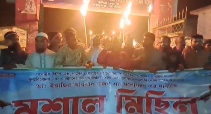 আল আমিন, নাটোর প্রতিনিধি :- নাটোর-১ আসনে (লালপুর-বাগাতিপাড়া) বিএনপি মনোনীত ধানের শীষের প্রার্থী ব্যারিস্টার ফারজানা শারমিন পুতুলের প্রার্থিতা বাতিল ও নতুন প্রার্থী ঘোষণার দাবিতে মশাল মিছিল অনুষ্ঠিত হয়েছে। আজ বুধবার সন্ধ্যা সাড়ে ছয়টার দিকে নাটোর-১ (লালপুর–বাগাতিপাড়া) আসনের মনোনয়ন প্রত্যাশী সাবেক যুব ও ক্রীড়া প্রতিমন্ত্রী মরহুম ফজলুর রহমান পটলের বড় ছেলে ও নাটোর জেলা বিএনপির সদস্য ডা. ইয়াসির আরশাদ রাজনের সমর্থকরা এ মিছিল করেন। লালপুর শ্রী সুন্দরী পাইলট মডেল উচ্চ বিদ্যালয় প্রাঙ্গণ থেকে মশাল মিছিলটি শুরু হয়ে রামকৃষ্ণপুর এলাকায় গিয়ে শেষ হয়। মিছিলকারীরা এ সময় ব্যারিস্টার পুতুলের মনোনয়ন বাতিল ও ডা. রাজনকে প্রার্থী ঘোষণার দাবিতে বিভিন্ন স্লোগান দেন। লালপুর ইউনিয়ন যুবদলের আহ্বায়ক শহিদুল ইসলাম বলেন,“তৃণমূল নেতাকর্মীদের মতামত উপেক্ষা করে মনোনয়ন দেওয়া হয়েছে। ধানের শীষের বিজয় নিশ্চিত করতে হলে দুঃসময়ের কান্ডারী ও ত্যাগী নেতা ডা. ইয়াসির আরশাদ রাজনকেই প্রার্থী করতে হবে। এ সময় অন্যান্য বক্তারা বলেন, প্রতিমন্ত্রী পটলের মৃত্যুর পর তার বড় ছেলে ডাক্তার রাজনের নেতৃত্বে লালপুরে বিএনপি’র রাজনীতি আবর্তিত হয়েছে। সেই জনপ্রিয় নেতাকে বাদ দিয়ে নতুন মুখের মনোনয়ন তৃণমূলের নেতাকর্মীরা মেনে নিবে না। এ সময় উপস্থিত ছিলেন উপজেলা বিএনপির সাবেক যুগ্ম আহবায়ক মো. আশরাফুল আলম লুলু, উপজেলা যুবদলের যুগ্ম আহবায়ক এনামুল হক কালু, উপজেলা ছাত্রদলের সভাপতি রায়হান কবির সুইট, গোপালপুর পৌর বিএনপির সাবেক সদস্য সচিব জিল্লুর রহমান, আড়বাব ইউনিয়ন যুবদলের সাংগঠনিক সম্পাদক মাইনুল হক শিমুল সহ উপজেলা ও পৌর বিএনপি’র সহযোগী সংগঠনের নেতা কর্মীরা। উল্লেখ্য, বিএনপি চেয়ারপার্সন বেগম খালেদা জিয়ার সাবেক উপদেষ্টা ও যুব ও ক্রীড়া প্রতিমন্ত্রী মরহুম ফজলুর রহমান পটলের বড় ছেলে ডা. ইয়াসির আরশাদ রাজন নাটোর জেলা বিএনপির সদস্য ও ছোট মেয়ে ব্যারিস্টার ফারজানা শারমিন পুতুল নাটোর জেলা বিএনপির যুগ্ম আহবায়ক। গত ৩ নভেম্বর ব্যারিস্টার ফারজানা শারমিন পুতুলকে নাটোর-১ আসনে ধানের শীষের প্রার্থী হিসেবে প্রাথমিক মনোনয়ন দেওয়া হয়। তখন থেকেই এই আসনে রাজশাহী বিশ্ববিদ্যালয় ছাত্রদলের সাবেক সভাপতি ও বিএনপি’র কেন্দ্রীয় কার্য নির্বাহী কমিটির সহ-দফতর সম্পাদক এড. তাইফুল ইসলাম টিপুর অনুসারীরা এবং ঢাকা মেডিকেল কলেজের সাবেক ভিপি ও পুতুলের বড় ভাই ডাক্তার ইয়াসির আরশাদ রাজনের সমর্থকরা পৃথক কর্মসূচির মধ্য দিয়ে পুতুলের মনোনয়ন বাতিল করার দাবি জানিয়ে আসছেন। তবে পুতুলের অনুসারীরা ব্যারিস্টার পুতুলকে সবচেয়ে যোগ্য প্রার্থী বলে দাবি করে আসছেন।