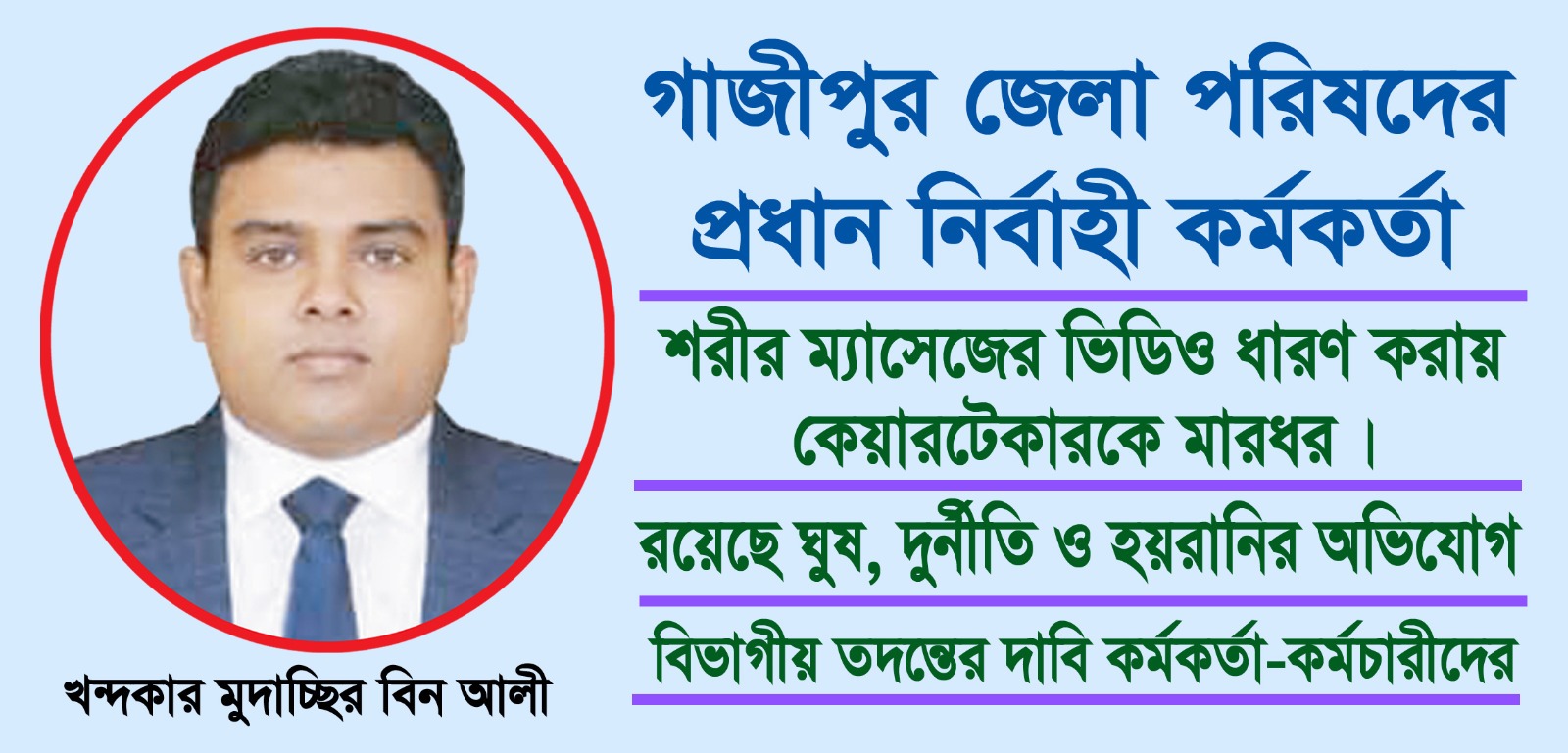 গত শনিবার (৮ অক্টোবর) রাতে গাজীপুর জেলা পরিষদের প্রধান নির্বাহী কর্মকর্তা খন্দকার মুদাচ্ছির বিন আলীর হাত-পা ও শরীর ম্যাসেজ করার একটি ভিডিও ধারণ করায় তারই কেয়ারটেকার জুয়েলকে বেধড়কভাবে পেটায় এবং রক্তাক্ত জখম করেন। মুদাচ্ছির বিন আলীর শরীর ম্যাসেজ ও জুয়েলকে রক্তাক্ত জখমের একটি ভিডিও এ প্রতিবেদকের হাতে সংরক্ষিত রয়েছে।