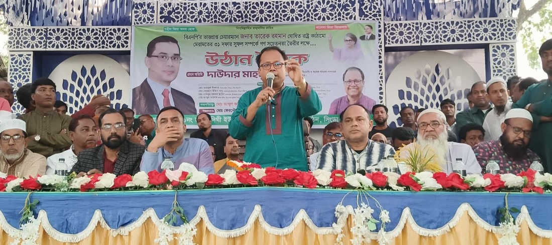 আল আমিন, নাটোর প্রতিনিধি:- নাটোর জেলা বিএনপির যুগ্ম আহ্বায়ক, সিংড়া উপজেলা বিএনপির সাবেক সাধারণ সম্পাদক ও নাটোর-৩ (সিংড়া) আসনে বিএনপির মনোনয়ন প্রত্যাশী দাউদার মাহমুদ বলেছেন, তারেক রহমান ঘোষিত ৩১ দফা দেশের সকল শ্রেণীর মানুষের জন্য। সকল মানুষের অধিকারের কথা ৩১ দফায় বলা হয়েছে। রাষ্ট্র কাঠামো মেরামতের ৩১ দফার মধ্যে তারেক রহমান সবচেয়ে বেশি নারী অধিকারকে গুরুত্ব দিয়েছে। মা-বোনদের অধিকারকে মূল্যায়ন করেছে। ৩১ দফা শুধু মুসলিমের জন্য নয়, শুধু হিন্দুর জন্য নয়, শুধু পাহাড়ির জন্য নয়, শুধু সমতলের জন্য নয়। এটি বাংলাদেশের সকল শ্রেণির মানুষের জন্য। আজ সোমবার (২৪ নভেম্বর) বিকেল ৫টায় উপজেলার ছাতারদিঘী ইউনিয়নের কালীগঞ্জ বাজারে ইউনিয়ন বিএনপির আয়োজনে বিএনপির ভারপ্রাপ্ত চেয়ারম্যান তারেক রহমান ঘোষিত রাষ্ট্র কাঠামো মেরামতের ৩১ দফার সুফল সম্পর্কে গণসচেতনতা তৈরির লক্ষে উঠান বৈঠকে প্রধান অতিথির বক্তব্যে এসব বলেন তিনি। ছাতারদিঘী ইউনিয়ন বিএনপির সাবেক সভাপতি মো. আব্দুল জলিলের সভাপতিত্বে ও সাবেক সাধারণ সম্পাদক মো. ফেরদৌস আলম দুলালের সঞ্চালনায় এসময় বিশেষ অতিথি হিসেবে উপস্থিত ছিলেন পৌর বিএনপির সাবেক যুগ্ম আহ্বায়ক বোরহান উদ্দিন বাবু, উপজেলা যুবদলের আহ্বায়ক হাবিবুর রহমান, সদস্য সচিব আব্দুল মালেক, উপজেলা শ্রমিক দলের আহ্বায়ক মো. ওমর ফারুক, উপজেলা বিএনপির সদস্য সবুজ মাহমুদ, উপজেলা যুবদলের যুগ্ম আহ্বায়ক আবু সাইদ পলাশ, পৌর যুবদলের সদস্য সচিব আমিনুল হক, যুবদল নেতা আব্দুল্লাহ আল মমিন প্রমুখ।
