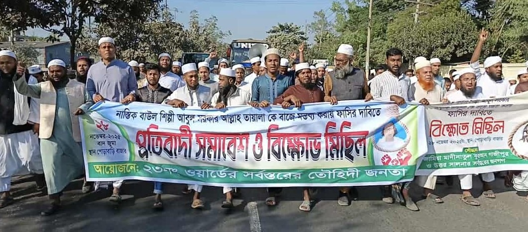 নিজস্ব প্রতিবেদক :- গাজীপুরের পোড়াবাড়ি এলাকায় বাউল শিল্পী আবুল সরকার আল্লাহ তায়ালা সম্পর্কে ‘বাজে, মন্তব্য’ করায় তাঁর দৃষ্টান্তমূলক শাস্তি ও ফাঁসির দাবিতে বিক্ষোভ মিছিল ও প্রতিবাদী সমাবেশ অনুষ্ঠিত হয়েছে। শুক্রবার জুম্মার নামাজের পর ২৩ নম্বর ওয়ার্ডের সর্বস্তরের তৌহিদী জনতা সংখ্যায় বিপুল জমায়েত হয়ে এ বিক্ষোভ মিছিল বের করে। স্থানীয় মসজিদ থেকে মিছিলটি শুরু হয়ে পোড়াবাড়ি বাজারের বিভিন্ন সড়ক প্রদক্ষিণ করে। প্রতিবাদকারীরা এসময় আবুল সরকারের বিরুদ্ধে স্লোগান দেন এবং তাঁর ‘অবমাননাকর মন্তব্যের’ কঠোর বিচার দাবি করেন। বক্তারা বলেন, একজন শিল্পী হয়ে ধর্মীয় অনুভূতিতে আঘাত দেয়ার মতো বক্তব্য কখনোই গ্রহণযোগ্য নয়। এমন ঘটনার পুনরাবৃত্তি রোধে দ্রুত আইনগত ব্যবস্থা নেওয়া জরুরি। সমাবেশে অংশ নেওয়া তৌহিদী জনতা সরকারের কাছে দ্রুত ব্যবস্থা গ্রহণ ও বাউল শিল্পী আবুল সরকারের বিরুদ্ধে কঠোর শাস্তির দাবি জানায়। তারা বলেন, ধর্মীয় অনুভূতিতে আঘাত কোনোভাবেই সহ্য করা হবে না।
