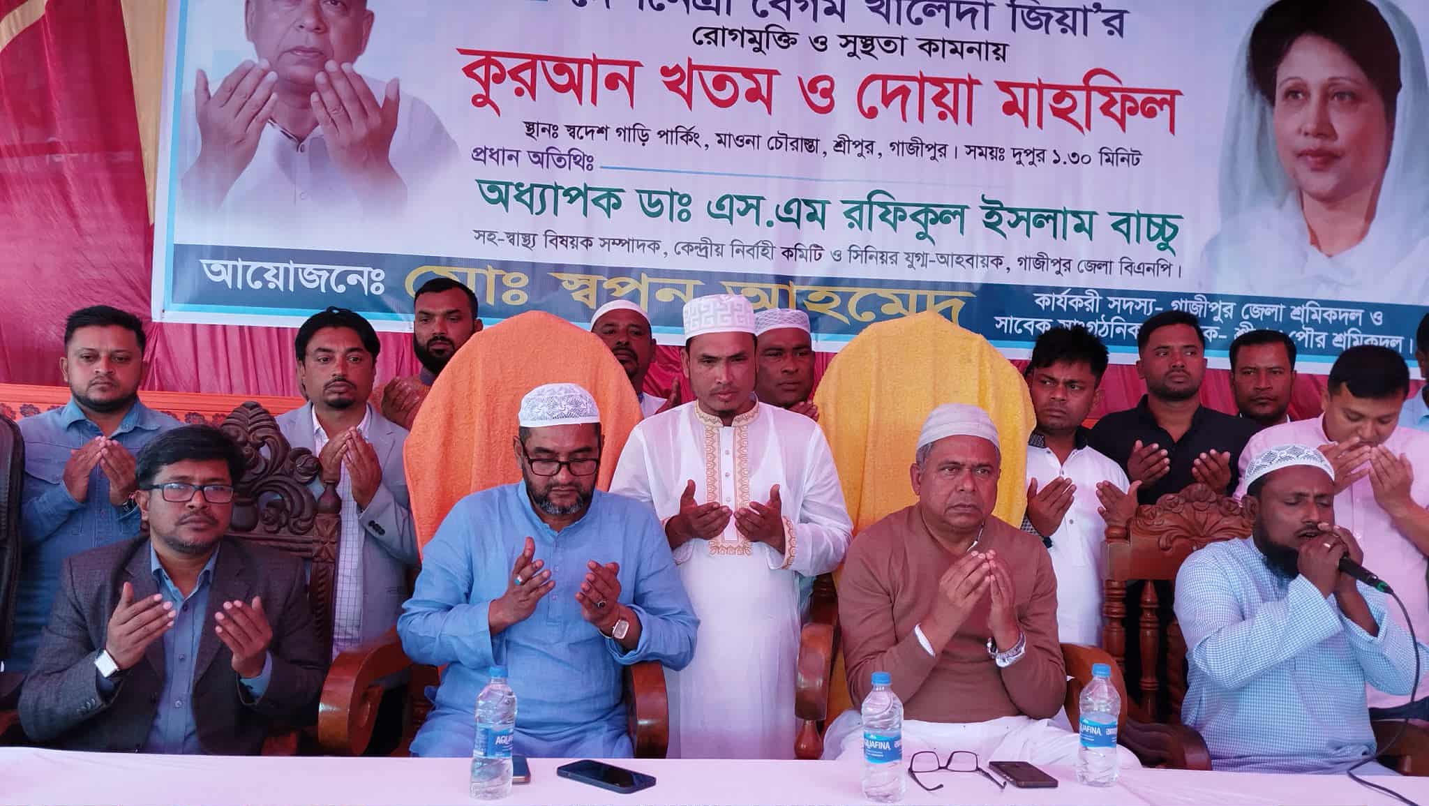 নিজস্ব প্রতিবেদক:- গাজীপুরের শ্রীপুরে বিএনপি চেয়ারপার্সন ও সাবেক প্রধানমন্ত্রী বেগম খালেদা জিয়ার রোগমুক্তি কামনায় গাজীপুর জেলা শ্রমিক দলের আহ্বায়ক সদস্য স্বপন আহমেদের আয়োজনে কোরআন খতম ও দোয়া অনুষ্ঠিত হয়েছে। আজ বুধবার (১০ ডিসেম্বর) দুপুরে মাওনা চৌরাস্তার দক্ষিণ পাশে স্বপন আহমেদের নিজ বাড়ি সংলগ্নে কোরআন খতম ও দোয়া মাহফিল অনুষ্ঠিত হয়।প্রধান অতিথি হিসেবে উপস্থিত ছিলেন,বিএনপির কেন্দ্রীয় কমিটির সহ-স্বাস্থ্য বিষয়ক সম্পাদক ও গাজীপুর-৩ আসনের বিএনপির মনোনীত প্রার্থী অধ্যাপক ডাক্তার এস এম রফিকুল ইসলাম বাচ্চু। প্রধান অতিথির বক্তব্যে ডাক্তার রফিকুল ইসলাম বাচ্চু বলেন,দেশের সর্বস্তরের মানুষের ভালোবাসা ও দোয়ায় আমাদের দেশনেত্রী আল্লাহর রহমতে সুস্থ হয়ে উঠবেন।তাঁর দ্রুত সুস্থতা কামনায় সবার কাছে দোয়া চাই।আমরা দোয়া করি বেগম খালেদা জিয়া যেন সুস্থ হয়ে আবারও দেশের কল্যাণে নেতৃত্বের হাল ধরতে পারেন।