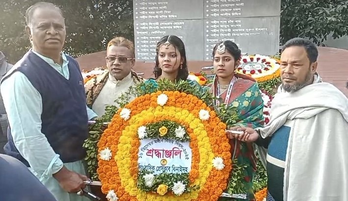 বিশেষ প্রতিনিধি মোঃ ফজলুল কবির গামা:- মহান বিজয় দিবস ২০২৫ উপলক্ষে ‘সাংবাদিক প্রেসক্লাব ঝিনাইদহ’ একটি বর্ণাঢ্য বিজয় মিছিলের আয়োজন করে। মিছিলে “সাংবাদিক প্রেসক্লাব ঝিনাইদহ” এর সকল সদস্য উপস্থিত ছিলেন। মিছিল শেষে সবাই ঝিনাইদহ কেন্দ্রীয় শহীদ মিনারে শহীদদের উদ্দেশ্যে শ্রদ্ধাঞ্জলি নিবেদন করেন। উক্ত বিজয় মিছিলে ‘সাংবাদিক প্রেসক্লাব ঝিনাইদহ’- এর উপদেষ্টা মোঃ আশরাফুল জামান সম্পাদক দি ক্রাইম রিপোর্ট, সভাপতি মোঃ ফজলুল কবির গামা, সাধারণ সম্পাদক পাপন চৌধুরী, মাজেদ শাহ দি ক্রাইম রিপোর্ট, তথ্য ও প্রযুক্তি সম্পাদক জুবাইদা তাসমিম সেতু, জান্নাতুল ফেরদৌস ঋতু, সাব ইন্সপেক্টর মুরাদুজ্জামান (ডিবি) সহ তার সহকারী পুলিশ ছাড়াও অনেক গণ্যমান্য ব্যক্তি ও নেতৃবৃন্দ উপস্থিত ছিলেন। ‘সাংবাদিক প্রেসক্লাব ঝিনাইদহ’- এর সভাপতি মোঃ ফজলুল কবির গামা বলেন,”এই দেশ আমরা পেয়েছি লাখো শহীদের রক্তের বিনিময়ে। তাই তাদের প্রতি কৃতজ্ঞতা জানানোর জন্য হলেও আমাদের সকলের উচিত বছরের এই দিনটা তাদের স্মরণ করা।” সেখানে ঝিনাইদহের জেলা প্রশাসক সহ সদর পুলিশের সদস্যরা, আনসার বাহিনী, বিভিন্ন স্বেচ্ছাসেবী সংস্থা, স্কুল কলেজের শিক্ষক ও ছাত্র-ছাত্রীরাও শ্রদ্ধাঞ্জলি নিবেদন করেন।