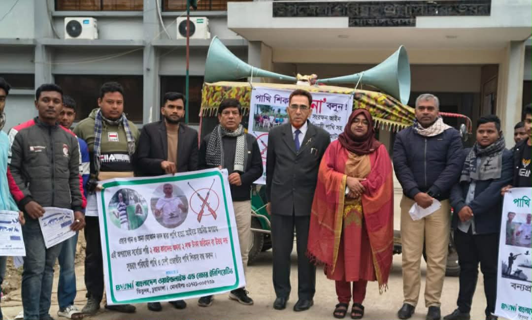 বশিরুল আলম,আলমডাঙ্গা (চুয়াডাঙ্গা) জেলার বিভিন্ন উপজেলায় অনেকগুলো ছোট বড় জলমহাল আছে। এরফলে প্রতিবছর শীত মৌসুমে স্থানীয় দেশীয় পাখির পাশাপাশি অগনিত অতিথি ও পরিযায়ী পাখির আনাগোনা বেড়ে যায় সবগুলো জলাকারে-ই। আর ঠিক এই সুযোগে কিছু অসাধু পাখি শিকারীর দল জেলার প্রায় প্রতিটা স্থানেই পাখি ধরা, মারা, ক্রয়- বিক্রয় ও পাচারে লিপ্ত হয়ে পড়ে পুরোদমে। যা প্রাকৃতিক ভারসাম্য রক্ষার্থে সত্যিই অমানবিক কার্যকলাপ। আর এই কর্মকান্ডের প্রতিবাদ ও বন্যপ্রাণী রক্ষার্থে বাংলাদেশ ওয়াইল্ড লাইফ এন্ড নেচার ইনিশিয়েটিভ সংগঠন গতকাল হতে চুয়াডাঙ্গা সদর উপজেলার ১০টি ইউনিয়ন ব্যাপী প্রচারণার শুভ উদ্ভোদন অনুষ্ঠিত হয়। চুয়াডাঙ্গা সদর উপজেলা চত্বর থেকে শুরু হয় সংগঠনের প্রচার কার্যক্রম। এসময় উপস্থিত ছিলেন, উপজেলা নির্বাহী কর্মকর্তা রিফাত আরা সহসংগঠনের উপদেষ্টা ও চুয়াডাঙ্গা জেলা আইনজীবি সমিতির নবনির্বাচিত সাধারণ সম্পাদক মানি খন্দকার, চুয়াডাঙ্গা পৌর ডিগ্রি কলেজ এর সাবেক অধ্যক্ষ শাহাজাহান। এসময় উপজেলা নির্বাহী কর্মকর্তা রিফাত আরা বলেন, বাংলাদেশ ওয়াইল্ড লাইফ এন্ড নেচার ইনিশিয়েটিভ আজকের এই কার্যক্রম সত্যি প্রশংসনীয়। জীব বৈচিত্র্য রক্ষায় পাখির গুরুত্ব অতুলনীয়। পাখিসহ সকল বন্যপ্রাণী সংরক্ষণে আমাদের সকলকে এগিয়ে আসতে হবে। যদি তা না হয় তবে মানুষের অস্তিত্ব বিলীন হবে। তাই পাখি ও বন্যপ্রাণী হত্যা বন্ধে জনসচেতনতা খুবই জরুরী। এরপর সংগঠনের সভাপতি ও বড় সলুয়া নিউ মডেল ডিগ্রি কলেজ এর প্রাণিবিদ্যা প্রভাষক আহসান হাবীব শিপলু বলেন, দীর্ঘদিন যাবত পাখি শিকার বন্ধে আমরা কাজ করে যাচ্ছি। তারপরও কিছু অসাধু পাখি শিকারীরা প্রায় পাখি শিকার করে যাচ্ছেন যা খুবই কষ্টদায়ক। পাখি আমাদের কৃষি ও পরিবেশের ভারসাম্য রক্ষার্থে ব্যপক ভূমিকা রাখে। তাই পাখি শিকার, হত্যা, পাচার রোধে আমাদের এই প্রচারণা।