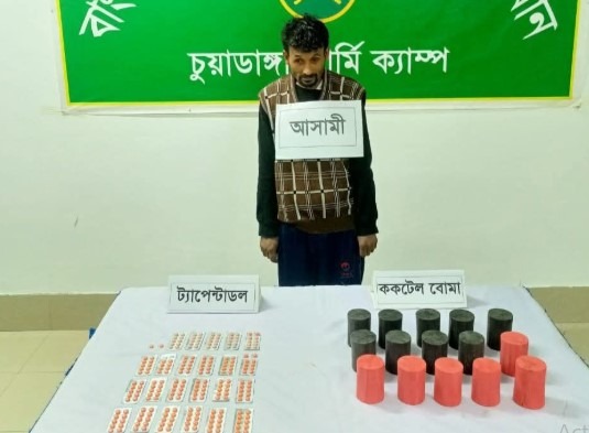 বশিরুল আলম,আলমডাঙ্গা (চুয়াডাঙ্গা) থেকে:- চুয়াডাঙ্গায় সেনাবাহিনী ও পুলিশের যৌথ অভিযানে বিপুল পরিমাণ বিস্ফোরক ও মাদকদ্রব্য উদ্ধার করা হয়েছে। এ সময় ১৫টি ককটেল বোমা ও ২৩০ পিস ট্যাপেন্ডা ট্যাবলেটসহ নূরনগর এলাকার এরিন বাদশা নামে এক ব্যক্তিকে গ্রেফতার করা হয়। মঙ্গলবার (৬ জানুয়ারি) ভোর রাতে চুয়াডাঙ্গা আর্মি ক্যাম্পের ক্যাপ্টেন সৌমিক আহমেদ অয়ন-এর নেতৃত্বে সেনাবাহিনী ও পুলিশের সমন্বয়ে গঠিত একটি যৌথ আভিযানিক দল চুয়াডাঙ্গা পৌর এলাকার নূরনগর গ্রামে এরিন বাদশার নিজ বাসভবনে অভিযান পরিচালনা করে। অভিযানে তার বসতঘর থেকে এসব ককটেল বোমা ও মাদকদ্রব্য উদ্ধার করা হয়। যৌথ বাহিনী সূত্রে জানা যায়, গোপন সংবাদের ভিত্তিতে এ অভিযান পরিচালনা করা হয়। অভিযানের সময় উদ্ধারকৃত ককটেল বোমাগুলো তাৎক্ষণিকভাবে নিরাপদ হেফাজতে নেওয়া হয় এবং উদ্ধার হওয়া ট্যাপেন্ডা ট্যাবলেট জব্দ করা হয়।স্থানীয়দের মতে, অভিযানের পর এলাকায় স্বস্তি ফিরে এসেছে। দীর্ঘদিন ধরে ওই এলাকায় অপরাধমূলক তৎপরতা নিয়ে আতঙ্ক বিরাজ করছিল বলে তারা জানান। গ্রেফতারকৃত এরিন বাদশার বিরুদ্ধে বিস্ফোরক ও মাদকদ্রব্য আইনে প্রয়োজনীয় আইনগত ব্যবস্থা গ্রহণ প্রক্রিয়াধীন রয়েছে বলে জানিয়েছে সংশ্লিষ্ট কর্তৃপক্ষ। উদ্ধারকৃত আলামতসমূহ পরবর্তী তদন্তের জন্য থানায় হস্তান্তর করা হয়েছে। আইনশৃঙ্খলা রক্ষাকারী বাহিনীর পক্ষ থেকে জানানো হয়, অপরাধ ও মাদক নির্মূলে এ ধরনের যৌথ অভিযান ভবিষ্যতেও অব্যাহত থাকবে।