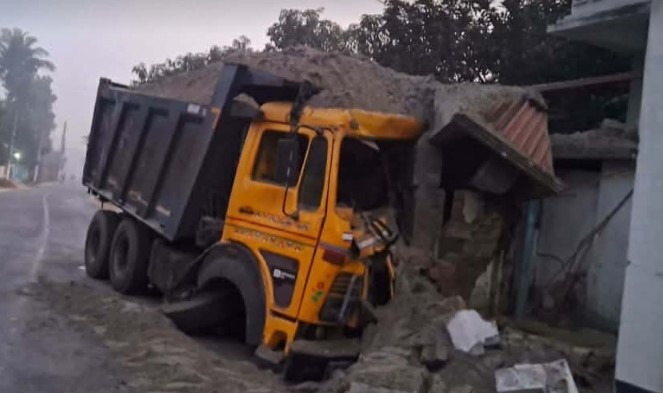 বশিরুল আলম,আলমডাঙ্গা (চুয়াডাঙ্গা) প্রতিনিধি: আজ বৃহস্পতিবার (৮জানুয়ারি) ভোর পৌনে ছয়টায় চুয়াডাঙ্গা শহরের কানাপুকুর সংলগ্ন রেল বাজার এলাকায় এক ভয়াবহ দুর্ঘটনা ঘটেছে। বেপরোয়া গতির একটি বালুবাহী ড্রাম ট্রাক নিয়ন্ত্রণ হারিয়ে রেল বাজারের ব্যবসায়ী মরহুম বাচ্চু মিয়ার বাড়ির সীমানা প্রাচীর ভেঙে ভেতরে ঢুকে পড়ে। প্রত্যক্ষদর্শীরা জানান, ভোরের নিরবতায় হঠাৎ বিকট শব্দে এলাকাবাসী ঘুম ভেঙে বাইরে বেরিয়ে আসেন।