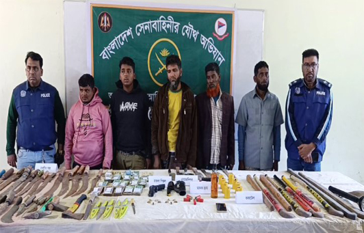 আজ শুক্রবার (৯ জানুয়ারি) ভোর থেকে শুরু হয় এই অভিযান। এ সময় পুলিশের খোয়া যাওয়া একটি আগ্নেয়াস্ত্র, কয়েক রাউন্ড গুলি ও বিপুল দেশীয় অস্ত্রশস্ত্র উদ্ধার করা হয়। হাতেনাতে আটক করা হয় পাঁচজনকে। এই পাঁচজন চিহ্নিত সন্ত্রাসী বলে সেনাবাহিনীর পক্ষ থেকে জানানো হয়েছে। আটক পাঁচজন হলেন মোহাম্মদ স্বপন, পারভেজ, মতিন, জাকির ও রিংকু মিয়া।