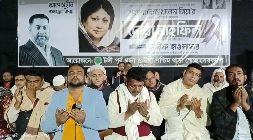 হানিফ পাঠান, গাজীপুর:- টঙ্গীতে বাংলাদেশ জাতীয়তাবাদী দল বিএনপির সাবেক তিনবারের সফল প্রধানমন্ত্রী ও প্রয়াত চেয়ারপার্সন বেগম খালেদা জিয়ার রুহের মাগফেরাত কামনায় কোরআন তেলাওয়াত ও এক বিশাল দোয়া মাহফিল অনুষ্ঠিত হয়েছে। শুক্রবার সন্ধ্যায় টঙ্গী পূর্ব ও পশ্চিম থানা স্বেচ্ছাসেবক দলের যৌথ উদ্যোগে টঙ্গীর দারুল উলুম মাদ্রাসা মাঠ প্রাঙ্গণে এই দোয়া মাহফিল অনুষ্ঠিত হয়। টঙ্গী পূর্ব থানা সেচ্ছাসেবক দলের সভাপতি আরিফুল ইসলাম সুবেল এর সভাপতিত্বে ও টঙ্গী পূর্ব থানা সেচ্ছাসেবক দলের যুগ্ন আহবায়ক আলমগীর হোসেন দীপুর সঞ্চালনায় অনুষ্ঠানে প্রধান অতিথি হিসেবে উপস্থিত ছিলেন কেন্দ্রীয় স্বেচ্ছাসেবক দলের সহ-সভাপতি আরিফ হোসেন হাওলাদার। তিনি তার বক্তব্যে বেগম খালেদা জিয়ার আপসহীন নেতৃত্ব এবং দেশের গণতন্ত্র রক্ষায় তার অসামান্য অবদানের কথা শ্রদ্ধাভরে স্মরণ করেন। তিনি বলেন, “দেশনেত্রী বেগম খালেদা জিয়া ছিলেন দেশপ্রেম ও সাহসের প্রতীক। তার আদর্শকে বুকে নিয়েই আমাদের সামনে এগিয়ে যেতে হবে। দোয়া মাহফিলে বিশেষ অতিথি হিসেবে উপস্থিত ছিলেন টঙ্গী পূর্ব থানা বিএনপির সাবেক প্রতিষ্ঠাতা আহবায়ক রাশেদুল ইসলাম কিরন, টঙ্গী পশ্চিম থানা সেচ্ছাসেবক দলের আহবায়ক আবু বক্কর সিদ্দিক। ৪৬ নং ওয়ার্ড বিএনপির সভাপতি লিয়াকত হোসেন। মহানগর যুবদলের যুগ্ম আহবায়ক ফয়সাল হোসেন,৪৬ নং ওয়ার্ড বিএনপির সাধারণ সম্পাদক সোহেল, টঙ্গী পশ্চিম থানা যুবদলের নবনির্বাচিত সাধারণ সম্পাদক আজিজুর রহমান টিপুসহ গাজীপুর মহানগর টঙ্গী পূর্ব ও পশ্চিম থানা বিএনপি, স্বেচ্ছাসেবক দল এবং এর অঙ্গ ও সহযোগী সংগঠনের অসংখ্য নেতাকর্মী।আলোচনা সভায় স্থানীয় নেতৃবৃন্দ বেগম খালেদা জিয়ার রাজনৈতিক জীবনের বিভিন্ন গুরুত্বপূর্ণ দিক নিয়ে আলোকপাত করেন এবং তার বিদেহী আত্মার শান্তি কামনা করেন। আলোচনা সভা শেষে এক বিশেষ মোনাজাত পরিচালনা করা হয়। মোনাজাতে বেগম খালেদা জিয়ার রুহের মাগফেরাত কামনাসহ দেশ ও জাতির কল্যাণ এবং উত্তরোত্তর সমৃদ্ধি প্রার্থনা করা হয়। এ সময় উপস্থিত শত শত নেতাকর্মী আবেগাপ্লুত হয়ে মোনাজাতে শরিক হন। স্বেচ্ছাসেবক দলের স্থানীয় নেতৃবৃন্দ জানান, বেগম খালেদা জিয়ার স্মৃতিকে অম্লান রাখতে এবং তার আদর্শ বাস্তবায়নে তারা ঐক্যবদ্ধভাবে কাজ করে যাবেন। দোয়া মাহফিল শেষে উপস্থিত সকলের মাঝে তবারক বিতরণ করা হয়।