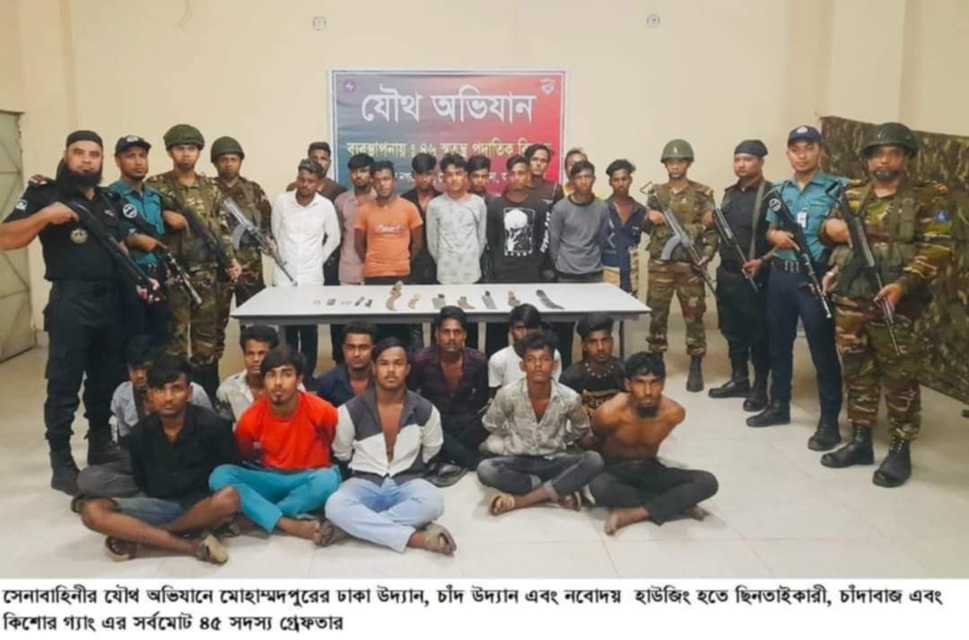 নিজস্ব প্রতিবেদক:: দেশের চলমান পরিস্থিতিতে জনসাধারণের জান- মাল ও সরকারি গুরুত্বপূর্ণ স্থাপনাসমূহের সার্বিক নিরাপত্তা এবং আইন-শৃঙ্খলা পরিস্থিতি নিয়ন্ত্রণের পাশাপাশি বিচার বহির্ভূত কর্মকাণ্ড রোধ ও আইনের শাসন সমুন্নত রাখার লক্ষ্যে দেশব্যাপী নিরপেক্ষতা ও পেশাদারিত্বের সাথে কাজ করছে বাংলাদেশ সেনাবাহিনী। এরই ধারাবাহিকতায় গত ২৬ অক্টোবর ২০২৪ (শনিবার) আনুমানিক রাত ১০টার দিকে মোহাম্মদপুর এলাকা থেকে সেনাবাহিনীর ৪৬ স্বতন্ত্র ব্রিগেড, র্যাব এবং পুলিশের সমন্বয়ে এই যৌথ অভিযান পরিচালিত হয়। এই অভিযানে সেনাবাহিনী, র্যাব এবং পুলিশের একাধিক দল অংশগ্রহণ করে। নিরাপত্তাহীনতায় নিমজ্জিত মোহাম্মদপুরবাসীর জীবনে স্বস্তি আনয়নের লক্ষ্যে যৌথ বাহিনীর এ অভিযান সুপরিকল্পিতভাবে পরিচালিত হয়। এই অভিযানে মোহাম্মদপুর এলাকা হতে ৪৫ জন অপরাধী (০৯ টি দেশীয় ধারালো অস্ত্রসহ) গ্রেপ্তার হয়। ম্যাজিস্ট্রেসি ক্ষমতাপ্রাপ্তির পর থেকে মোহাম্মদপুর, আদাবর এবং শের-ই-বাংলানগর থানাধীন ১৫২ জন অপরাধী, ১৮টি আগ্নেয়াস্ত্র, ২৭১ রাউন্ড গোলাবারুদ, ১৭২ ধরনের বিভিন্ন দেশী বিদেশী অস্ত্র, ১টি গ্রেনেড এবং বিপুল পরিমাণ নেশাজাত দ্রব্য উদ্ধার হয়। সন্ত্রাস দমন এবং আইন শৃঙ্খলা পরিস্থিতির উন্নয়নে সেনাবাহিনীর কঠোর অবস্থান অব্যাহত থাকবে। গ্রেফতারের পরে প্রাথমিক জিজ্ঞাসাবাদ শেষে তাদেরকে পুলিশের নিকট হস্তান্তর করা হয়েছে।