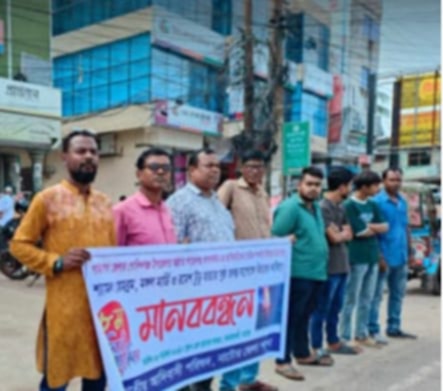 আল আমিন, নাটোর প্রতিনিধি :- গাইবান্ধা জেলার গোবিন্দগঞ্জ উপজেলার সাহেবগঞ্জ বাগদাফার্ম এর আদিবাসীদের পৈত্রিক সম্পত্তি ফিরিয়ে দেয়া, শ্যামল হেমব্রম, মঙ্গল মার্ডি ও রমেশ টুডু হত্যার সুষ্ঠু তদন্ত সাপেক্ষে দোষীদের বিচারের দাবীতে মানববন্ধন করেছে জাতীয় আদিবাসী পরিষদ নাটোর জেলা শাখা। আজ বুধবার দুপুর বারোটার দিকে নাটোর প্রেসক্লাবের সামনে এই মানববন্ধন অনুষ্ঠিত হয়। মানববন্ধনে জাতীয় আদিবাসী পরিষদ নাটোর জেলা শাখার সভাপতি নরেশ চন্দ্র ওরাও এর সভাপতিত্বে অন্যান্যের মধ্যে উপস্থিত ছিলেন জাতীয় আদিবাসী পরিষদ নাটোর জেলা শাখার সাধারণ সম্পাদক প্রদীপ লাকরা, সদস্য নির্মল পাহান, অখিল বাসকি, নলডাঙ্গা উপজেলার সাধারণ সম্পাদক বাবলু পাহান প্রমুখ।