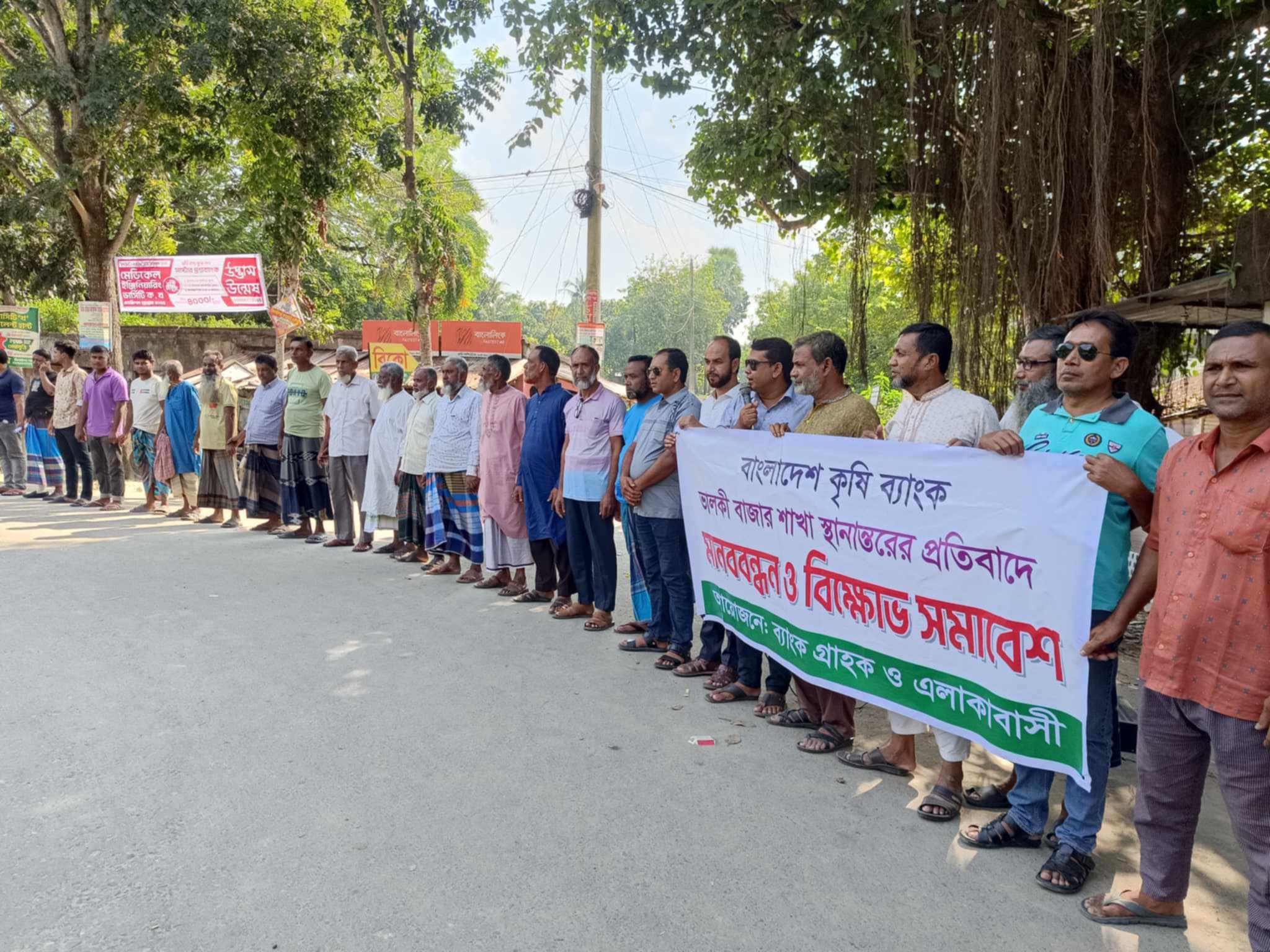 ঝিনাইদহ থেকে বিশেষ প্রতিনিধি মোঃ ফজলুল কবির গামা: ঝিনাইদহের হরিণাকুন্ডু উপজেলার ভালকী বাজারে কৃষি ব্যাংকের শাখা অফিস স্থানান্তরের চেষ্টার প্রতিবাদে এলাকাবাসি মানববন্ধন ও বিক্ষোভ সমাবেশ করেছে। রোববার দুপুরে উপজেলার কাপাশহাটিয়া ইউনিয়নের ভালকী বাজারে ব্যাংকের শত শত গ্রাহক ও এলাবাসি এই কর্মসুচিতে যোগ দেন। মানববন্ধন শেষে ভালকী বাজারে আয়োজিত এক সমাবেশে বক্তব্য রাখেন বীর মুক্তিযোদ্ধা ও সাবেক চেয়ারম্যান ইমদাদ হোসেন, মুক্তিযোদ্ধা রেজাউল ইসলাম, মহিউদ্দীন মাষ্টার, স্থানীয় মসজিদের ইমাম কুতুব উদ্দীন মন্ডল, বিসিআইসি সার ডিলার আব্দুল খালেক, স্কুল শিক্ষক ফয়জুর রহমান ফয়েজ, মোয়াজ্জেম হোসেন, খালেদুর রহমান, জাফর আলতাফ সোনা, সোহরাব হোসেন মন্ডল, সাবেক ইউপি সদস্য সালাহউদ্দীন, প্রভাষক ওলিয়ার রহমান, মিজানুর রহমান ও লিন্টু মন্ডল। সেসময় বক্তারা বলেন, হরিণাকুন্ডুর ভালকী বাজার বহু পুরানো জনপদ। এখানে চাকরীজীবী ও বড় বড় ব্যবসায়ী রয়েছেন। এই ব্যাংকে তাদের একাউন্ট রয়েছে। ব্যাংকটি অন্যত্র স্থানান্তর করা হলে গ্রাহকরা নিরাপত্তাহীনতায় পড়তে পারে। গ্রাহক ও গ্রামবাসি ব্যাংকটি যাতে অন্যত্র সরিয়ে না নেওয়া হয় সে বিষয়ে ব্যাংকের উর্ধ্বতন কর্মকর্তাদের প্রতি দৃষ্টি আকর্ষন করেন।