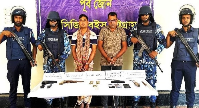 নিজস্ব প্রতিবেদক :: কক্সবাজারের মহেশখালীতে অভিযান চালিয়ে পুলিশের লুট হওয়া একটি পিস্তলসহ বেশ কিছু গুলি উদ্ধার করেছে কোস্ট গার্ড। এ সময় কক্সবাজারের ডাকাত সর্দার জিয়া বাহিনীর প্রধান জিয়াউর রহমান (৪৪) ও তার সঙ্গী মহিউদ্দিনকে (৩৮) আটক করা হয়। আজ বৃহস্পতিবার (১৪ নভেম্বর) সকালে কোস্ট গার্ড সদর দপ্তরের মিডিয়া কর্মকর্তা লেফটেন্যান্ট কমান্ডার খন্দকার মুনিফ তকি এ তথ্য জানান। উদ্ধার হওয়া অস্ত্রের মধ্যে আরও রয়েছে-পুলিশের লুট হওয়া একটি পিস্তল, একটি দেশিয় পিস্তল, দুইটি ম্যাগাজিন এবং ২২ রাউন্ড গুলি।