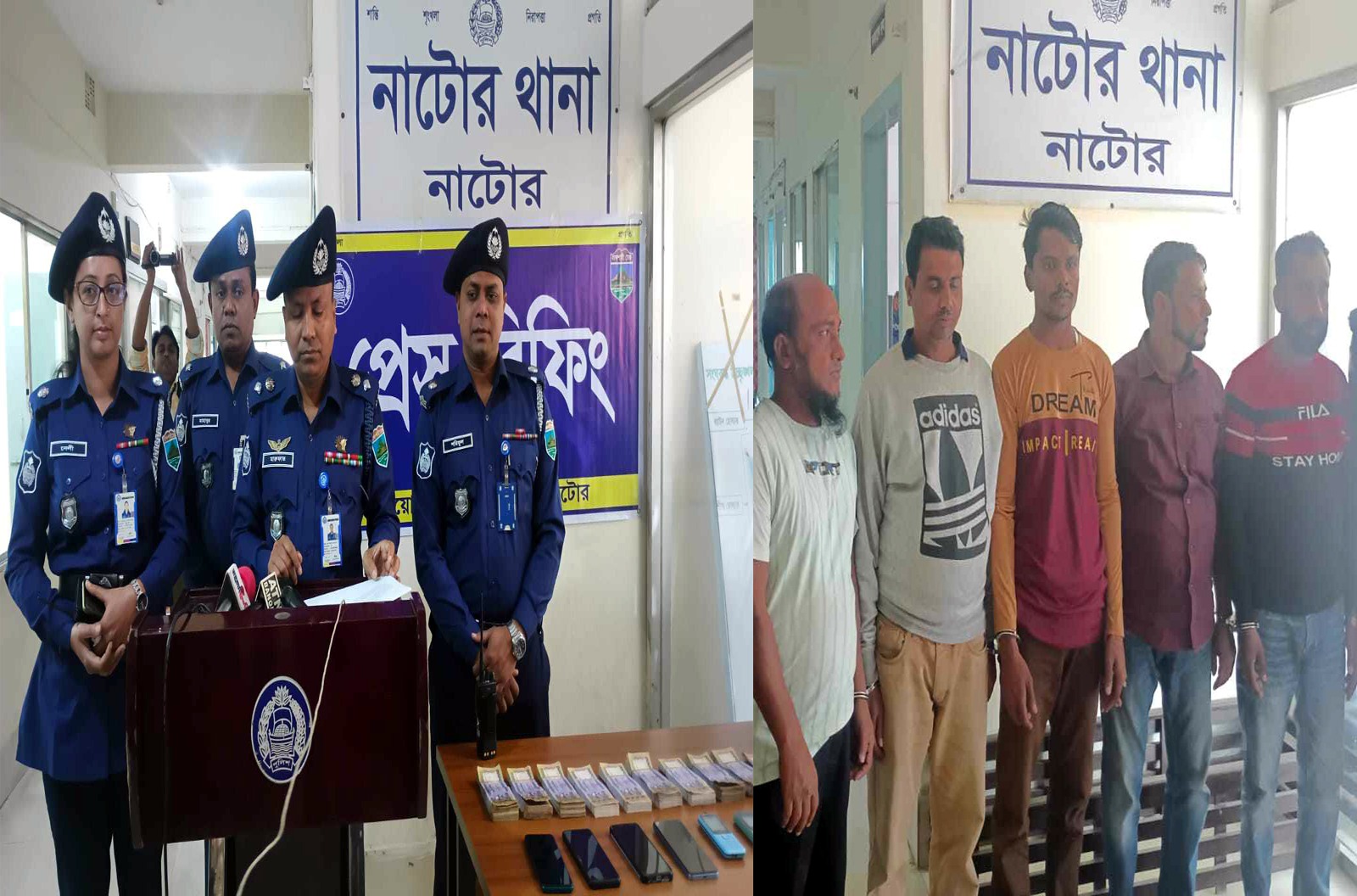 আল আমিন, নাটোর প্রতিনিধি :- নাটোরে যাত্রীবাহী বাসে তল্লাশি করে ৯ লাখ ৪৩ হাজার টাকার জাল নোটসহ পাঁচজনকে গ্রেফতার করেছে পুলিশ। আজ শনিবার দুপুরে সদর উপজেলার নাটোর-রাজশাহী মহাসড়কের নারায়ণপাড়া এলাকা থেকে জাল নোটসহ তাদের গ্রেফতার করা হয়। বিকেলে নাটোর সদর থানায় এক প্রেস ব্রিফিংয়ে পুলিশ সুপার মারুফাত হুসাইন এ বিষয়টি জানান। এ সময় উপস্থিত ছিলেন – অতিরিক্ত পুলিশ সুপার (প্রশাসন ও অর্থ) মো. শরিফুল ইসলাম, অতিরিক্ত পুলিশ সুপার (নাটোর সদর সার্কেল) মাহমুদা শারমীন নেলী, নাটোর সদর থানার ভারপ্রাপ্ত কর্মকর্তা (ওসি) মো. মাহবুর রহমান। পুলিশ সুপার মারুফাত হুসাইন জানান, গোপন সংবাদের ভিত্তিতে আজ দুপুরে নাটোর সদর উপজেলার নাটোর-রাজশাহী মহাসড়কের নারায়ণপাড়া এলাকায় রংপুরগামী মোহাম্মদ পরিবহন নামে একটি যাত্রীবাহী বাসে তল্লাশি করে পুলিশ। এ সময় মো. আরিফ হাওলাদার (৪০), মো. আরিফ হোসেন (৪৭), মো. মোস্তফা খান (৪৩), মো. রফিকুল ইসলাম (৪০) ও মো. ফেরদৌস হাওলাদারের (৩০) কাছ থেকে ১০০০ ও ২০০ টাকার মোট ৯ লাখ ৪৩ হাজার টাকার জাল নোট উদ্ধার করা হয়। এ ঘটনায় গ্রেফতারকৃত আসামিদের বিরুদ্ধে নাটোর সদর থানায় নিয়মিত মামলা দায়ের করা হয়েছে।