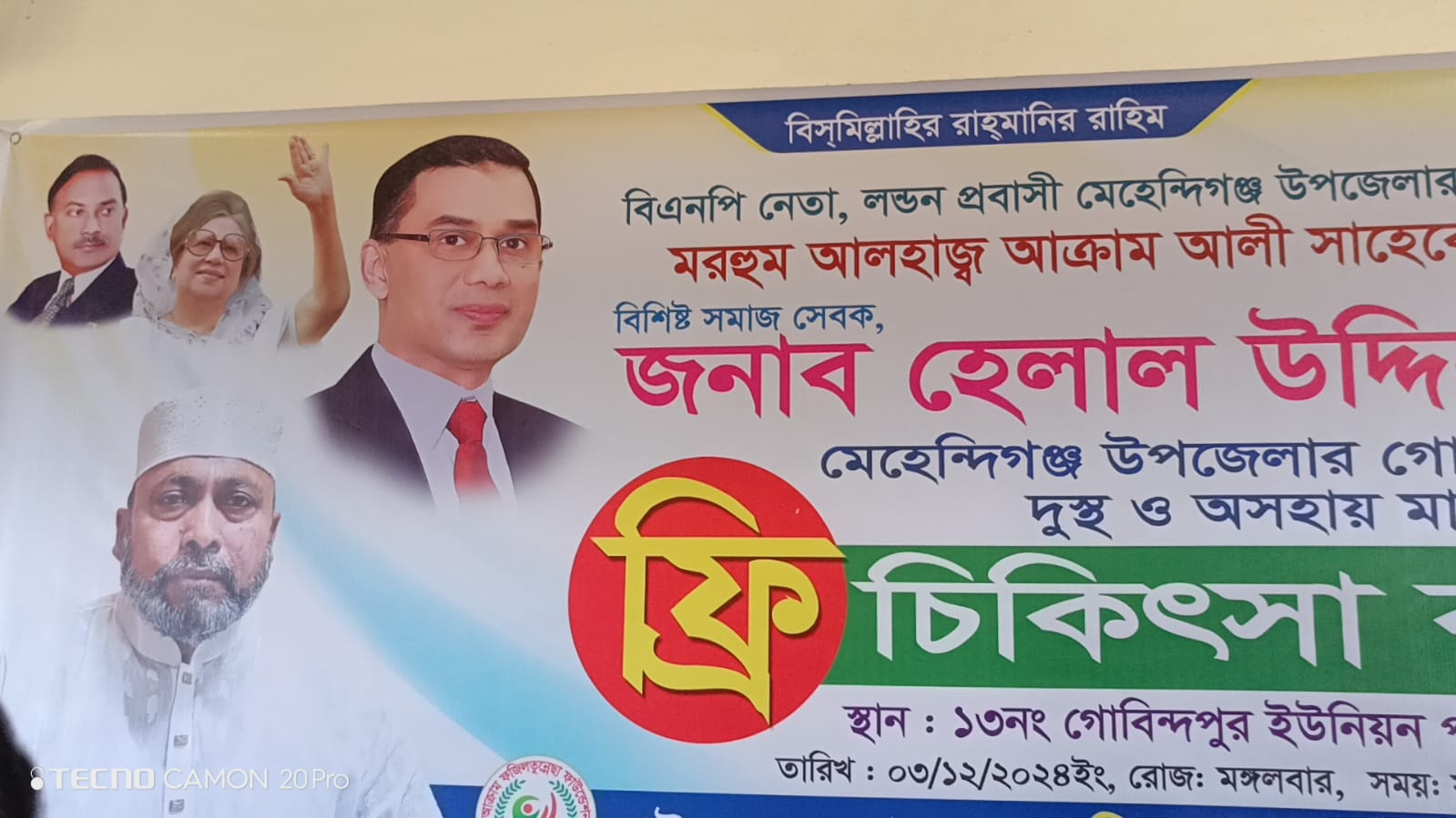 দিনভর মেডিসিন ও গাইনী ৬জন বিশেষজ্ঞ ডাক্তার চিকিৎসা সেবা প্রদান করেন। চিকিৎসকরা হলেন, ডাক্তার মোঃ আলীমুল ইসলাম, শুকলা চন্দ্র দাহার, ফারাবী, মেরি রানী মিত্রা, মাহামুদা জামান মিতু ও আমিনুল ইসলাম। এ মেডিকেল ক্যাম্পে হাজারো চরবাসী ফ্রী চিকিৎসা সেবা গ্রহণ করেন। বিএনপির মানবিক নেতা (লন্ডন প্রবাসী) হেলাল উদ্দিন’র পক্ষে ক্যাম্পের পরিচালক রিয়াজ উদ্দিন সরদার বলেন, প্রবাসী হেলাল উদ্দিন এর জন্ম মেহেন্দিগঞ্জের গোবিন্দপুর ইউনিয়নে, মাতৃত্বের টানে জন্মভূমির মানুষের সেবা করার মানসে ফ্রী মেডিকেল ক্যাস্প করেন।