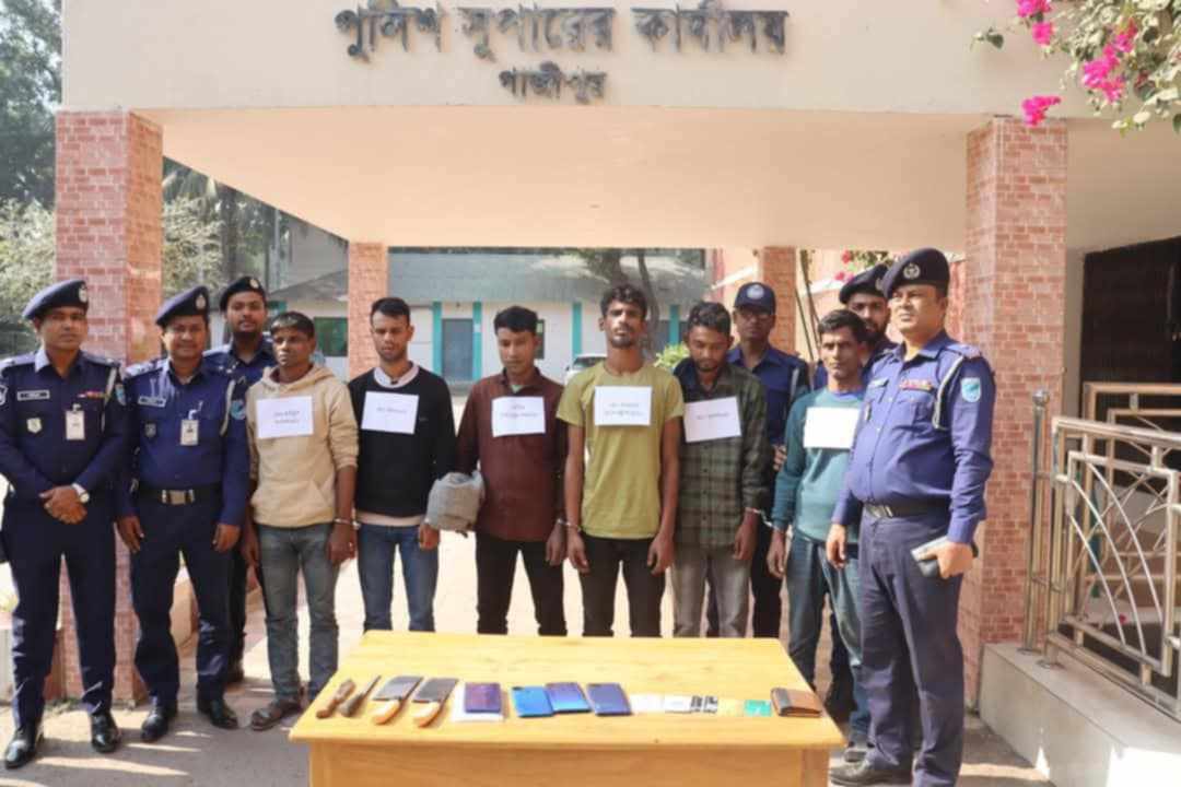 গ্রেফতারকৃত আসামিরা হলেন : ১। মোঃ সরওয়ার হোসেন শারু(২৮), পিতা-মোঃ হালিমউদ্দিন, পেশা- তাকওয়া পরিবহনের ড্রাইভার, স্থায়ী ঠিকানাঃ সাং-আমগাছীহান্দা, থানা-ধোবাউরা, জেলা- ময়মনসিংহ। ২। নাজিম উদ্দিন নয়ন(৩৫), পিতা- মোঃ আলী আজগর, পেশা-সিএনজি চালক, স্থায়ী ঠিকানাঃ সাং-কাশিয়াবা থানা-রৌমারী, জেলা- কুড়িগ্রাম। ৩। মোঃ ছাইফুল ইসলাম(8২), পিতা- মোঃ আজগর আলী, পেশা-সিএনজি চালক, স্থায়ী ঠিকানাঃ সাং- মধুপুর, থানা – ওলিপুর, জেলা- কুড়িগ্রাম। ৪। মোঃ জুয়েল(২৪), পিতা- মৃত আব্দুল মালেক, পেশা- আজমেরী বাসের হেলপার, স্থায়ী ঠিকানাঃ সাং-পূর্ব জামেরতলী, থানা ও জেলা- লক্ষীপুর। ৫। মোঃ মিলন(২৭), পিতা-মোঃ আব্দুল জলিল, পেশা- তাকওয়া পরিবহনের স্টাফ, স্থায়ী ঠিকানাঃ সাং- মোহনপুর,থানা- আাকেলপুর, জেলা- জয়পুরহাট। ৬। মোঃ আনোয়ার হোসেন(৩৫), পিতা- মৃত সুলতান বয়াতী, পেশা-চা দোকানদার ও চোরাই মোবাইল ফোনের ক্রেতাও বিক্রেতা, স্থায়ী ঠিকানাঃ সাং- আমিনাবাদ, থানা- চরফ্যাশন, জেলা-ভোলা।