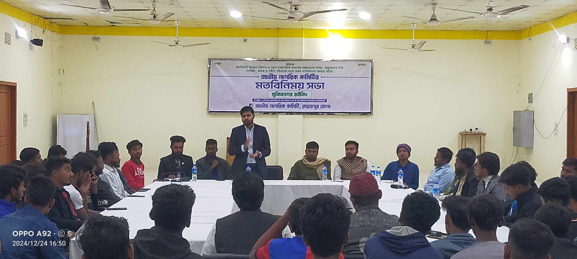 জেলা বৈষম বিরোধী ছাত্র আন্দোলনের সংগঠক আশিক রাব্বি এর সঞ্চালনায় মতবিনিময় সভায় সভাপতিত্ব করেন, জাতীয় নাগরিক কমিটির মাহমুদুল হাসান। অতিথি হিসেবে বক্তব্য রাখেন জাতীয় নাগরিক কমিটির কেন্দ্রীয় সংগঠক নাঈম আহমেদ। স্বাগত বক্তব্য রাখেন হাসনাত জামান সৈকত সমাপনী বক্তব্য রাখেন জাতীয় নাগরিক কমিটি কেন্দ্রীয় সদস্য শাকিল আহমেদ।