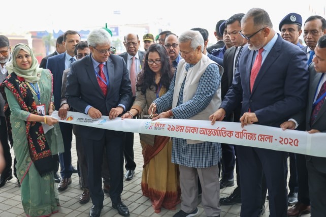 নিজস্ব প্রতিবেদক:: ঢাকা আন্তর্জাতিক বাণিজ্যমেলার (ডিআইটিএফ-২০২৫) উদ্বোধন করেছেন অন্তর্বর্তী সরকারের প্রধান উপদেষ্টা প্রফেসর ড. মুহাম্মদ ইউনূস। আজ বুধবার সকালে রাজধানীর উপকণ্ঠ পূর্বাচল নতুন শহরের বাংলাদেশ-চায়না ফ্রেন্ডশিপ এক্সিবিশন সেন্টারে মাসব্যাপী এ মেলার উদ্বোধন ঘোষণা করেন তিনি।