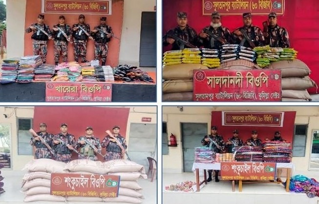 জব্দকৃত মালামালের মধ্যে রয়েছে ভারতীয় শাড়ি ৩৫৬টি, কিসমিস ৬৯ কেজি, বাসমতি চাল একহাজার ৪০৪ কেজি, দু’টি গরু, চারহাজার ৩২০ পিস চকলেট, চিনি পাঁচহাজার ৪৮০ কেজি, চুঁড়ি ১১৩ প্যাকেট, জিরা ৪৩ কেজি, জুতা ৫৮ জোড়া, ফুচকা ২১৩ প্যাকেট, বাংলাদেশী রসুন ২৮ কেজি, বিভিন্ন প্রকার কাপড় ২৮৩ পিস, রেডবুল তেল ৮৪ বোতল। এছাড়াও ইস্কাফ সিরাপ, হুইস্কি, ফেন্সিডিল-সহ জব্দ করা হয়েছে। উদ্ধারকৃত মালামালের আনুমানিক বাজারমূল্য ৪০ লাখ ৯২ হাজার দুইশ’ টাকা।