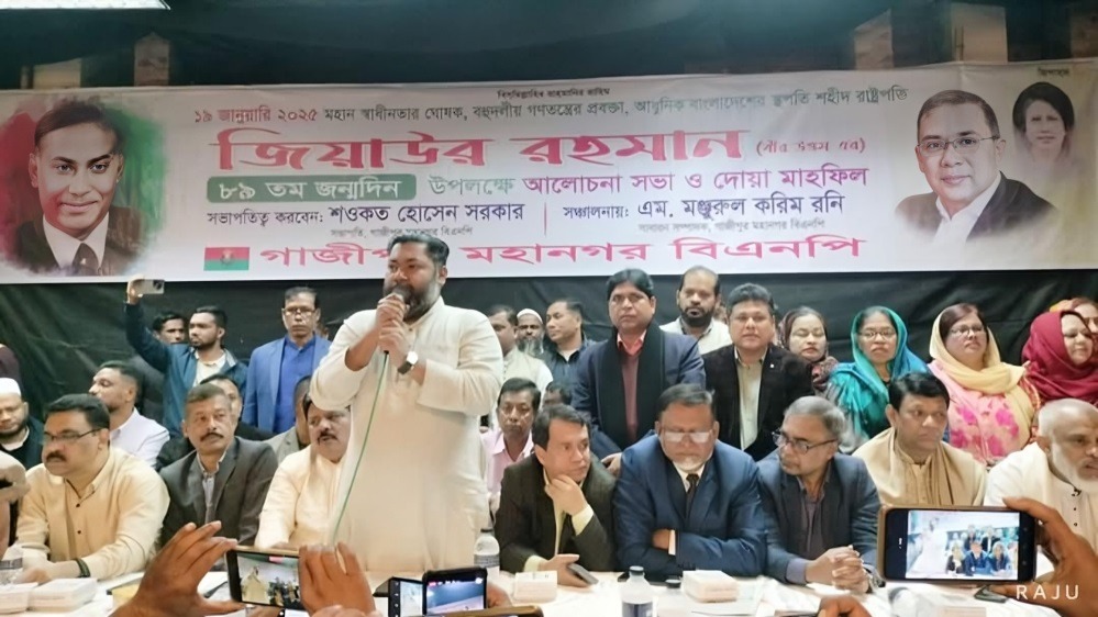 স্টাফ রিপোর্টার : বিএনপির প্রতিষ্ঠাতা ও সাবেক রাষ্ট্রপতি শহিদ জিয়াউর রহমানের ৮৯তম জন্মবার্ষিকী ও খালেদা জিয়ার রোগ মুক্তি কামনায় গাজীপুরে আলোচনা সভা, দোয়া মাহফিল অনুষ্ঠিত হয়েছে। সোমবার বিকালে গাজীপুর মহানগর বিএনপির উদ্যোগে নগরীর চান্দনা চৌরাস্তা এলাকায় একটি কমিউনিটি সেন্টারে আয়োজিত আলোচনা সভায় সভাপতিত্ব করেন মহানগর বিএনপির সভাপতি শওকত হোসেন সরকার। সাধারণ সম্পাদক এম. মঞ্জুরুল করিম রনির সঞ্চালনায় বক্তব্য রাখেন বিএনপি নেতা ড. শহীদুজ্জামান, মেহেদী হাসান এলিচ, অ্যাড. আব্দুস সালাম শামীম, রাকিব উদ্দিন সরকার পাপ্পু, হুমায়ুন কবির রাজু, সুরুজ আহমেদ, হাসান আজমল ভ‚ইয়া, তানভীর সিরাজ, মনিরুল ইসলাম মনির, কৃষকদল নেতা আতাউর রহমান প্রমুখ। এদিকে দুপুরে বাসন মেট্রো থানা শ্রমিকদলের উদ্যোগে বাসন সড়ক ঈদগাঁ মায়দানে এ দোয়া ও মিলাদ মাহফিল মাহফিলের আয়োজন করা হয়। পরে দুঃস্থদের মাঝে রান্না করা খাবার বিতরণ করা হয়।