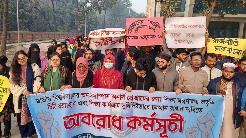 আন্দোলনরত শিক্ষার্থীরা জানান, ২০২৪-২৫ সেশনে অন ক্যাম্পাস অনার্স ভর্তি সার্কুলারের ব্যাপারে জাতীয় বিশ্ববিদ্যালয় কর্তৃপক্ষ এখন পর্যন্ত কোনো রকম পদক্ষেপ গ্রহণ না করে ছাত্র-ছাত্রী এবং অনার্সের তৃতীয় ব্যাচের ভর্তি সার্কুলারের ব্যাপারে বিভিন্ন ধরনের প্রপাগান্ডা ছড়ানো হচ্ছে, শিক্ষামন্ত্রণালয় থেকে প্রেরিত ছাত্র-ছাত্রীদের স্বার্থের বিরুদ্ধে ইস্যুকৃত চিঠি প্রত্যাহারের ব্যাপারে ভিসির আশ্বাসের পরে দীর্ঘদিন অতিবাহিত হলেও অদ্যাবধি কোনো কার্যকরী পদক্ষেপ গ্রহণ করা হয়নি। তাই অবিলম্বে তাদের দাবিগুলো মেনে নেওয়ার জন্য সুস্পষ্ট ঘোষণা দিতে হবে।