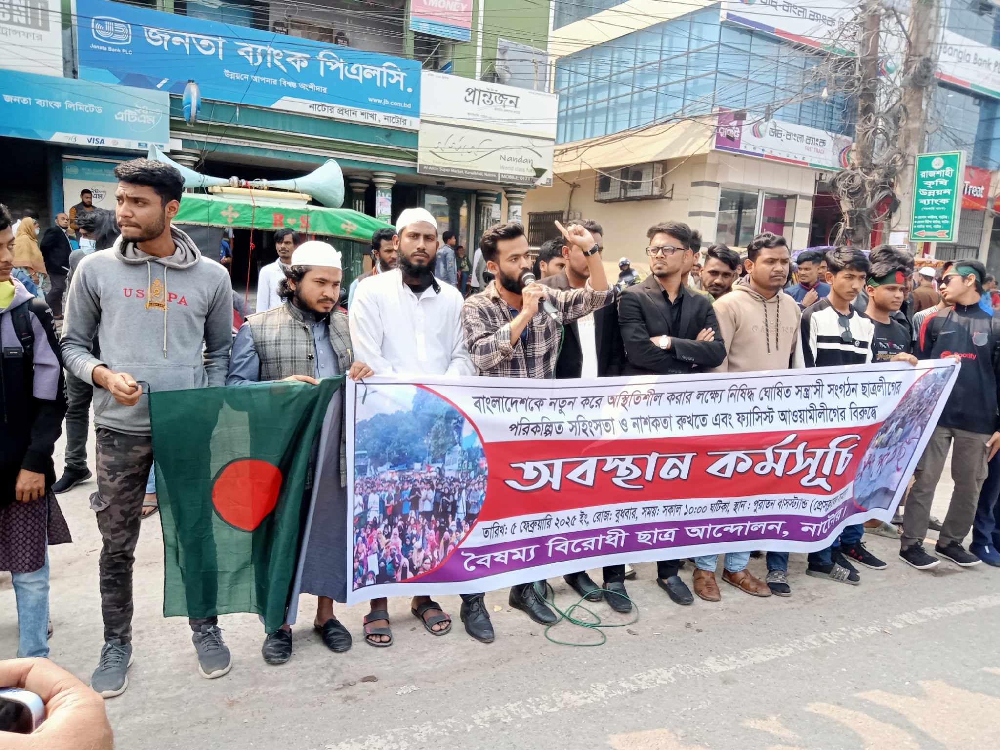 আল আমিন, নাটোর প্রতিনিধি :- নাটোরে নিষিদ্ধ ছাত্রলীগের পরিকল্পিত সহিংসতা ও নাশকতা রুখতে এবং ফ্যাসিস্ট আওয়ামী লীগের অপতৎপরতার বিরুদ্ধে অবস্থান কর্মসুচি পালন করেছে জেলা বৈষম্য বিরোধী ছাত্র আন্দোলনের সদস্যরা। আজ বুধবার সকালে শহরের কানাইখালি এলাকায় এই কর্মসুচি পালিত হয়।