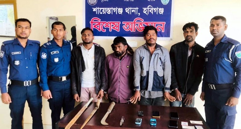 আটককৃতরা হলো জেলার মাধবপুর উপজেলার বাখরনগর গ্রামের জমির আলীর পুত্র ফয়সাল মিয়া (৩২), মানিকপুর গ্রামের শাহ আলম মিয়ার পুত্র রুবেল আহমদ রনি (২৬), সুন্দরপুর গ্রামের আছদ্দর আলীর পুত্র জয়নাল মিয়া (৪২), একই গ্রামের দুবাই মিয়ার পুত্র জালাল মিয়া (৩২) ও চুনারুঘাট উপজেলার উলুকান্দি গ্রামের ইদ্রিছ আলীর পুত্র রুহুল আমিন (২৪)।