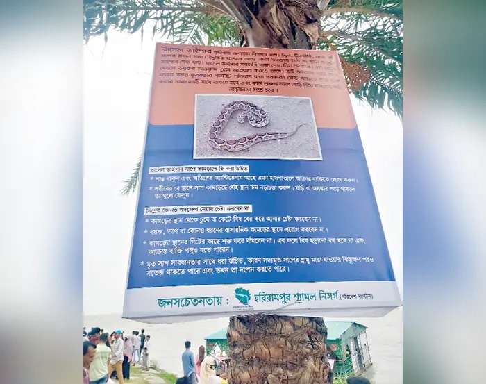 পদ্মায় নতুন পানি। চারদিকে ঢেউ খেলছে। স্রোতটাও বেশ। হরিরামপুরের আন্ধারমানিক এলাকার নদী পাড়ে গড়ে উঠেছে পর্যটনকেন্দ্র। স্থায়ী রেস্তরাঁর পাশাপাশি অস্থায়ী দোকানের ছড়াছড়ি। স্থানীয়রা নাম দিয়েছেন মিনি কক্সবাজার। এখানে ঢুকতেই চোখে পড়ে ব্যানারে রাসেলস ভাইপার নিয়ে সচেতনতামূলক নানা কথা লেখা। এই ব্যানার এলাকার অনেক স্থানেই দেখা মেলে। বিস্তৃত চর। চারিদিকে শুধু ফসলি জমি।