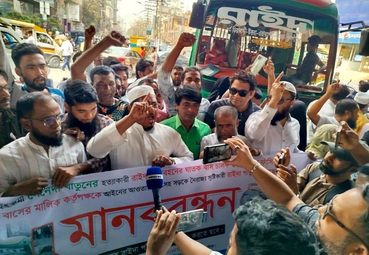স্টাফ রিপোর্টার, উত্তরা :: রাজধানীর উত্তরায় রাইদা পরিবহন বন্ধ ও মালিকের ফাঁসির দাবিতে মানববন্ধন ও মহাসড়ক অবরোধ করেছেন বাসচাপায় নিহত গেনেদা খাতুনের স্বজন ও এলাকাবাসী। উত্তরার হাউস বিল্ডিং এলাকায় আজ বৃহস্পতিবার নাগরিক সমাজের ব্যানারের এ মানববন্ধন করা হয়। পরে বেলা ১১টা থেকে দুপুর ১২টা পর্যন্ত ঢাকা-ময়মনসিংহ মহাসড়কের হাউস বিল্ডিং এলাকার মহাসড়ক অবরোধ করা হয়। এতে মহাসড়কে তীব্র যানজটের সৃষ্টি হয়। পরে পুলিশের ঊর্ধ্বতন কর্মকর্তাদের আশ্বাসে প্রায় দুই শতাধিক মানুষ মহাসড়ক ছেড়ে দেন।
