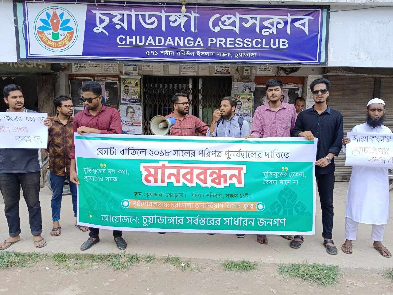 শনিবার চুয়াডাঙ্গা ভলান্টিয়ার্স ডিবেট ক্লাবের পৃষ্ঠপোষকতায় চুয়াডাঙ্গা প্রেসক্লাবের সামনে এ মানববন্ধন অনুষ্ঠিত হয়।