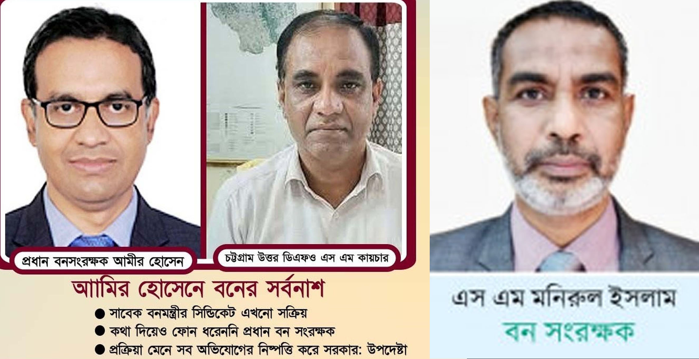 অভিযোগ আছে, প্রধান বন সংরক্ষক আমির হোসাইন চৌধুরী সিন্ডিকেটে পোস্টিং বাণিজ্যের মাধ্যমে হাতিয়ে নিয়েছে শত শত কোটি টাকা। যার কারণে বনবিভাগ আজ ধ্বংস প্রায়। তার সিন্ডিকেটের অন্যতম সদস্য হলেন ঢাকা সামাজিক বন অঞ্চলের বন সংরক্ষক এস এম মনিরুল ইসলাম। এই দুর্নীতি চক্রের নেপথ্যে ছিলেন, সাবেক বনমন্ত্রী সাহাব উদ্দিন এবং তার ছেলে জাকির হোসেন জুমন।