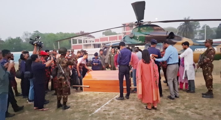 নিজস্ব প্রতিবেদক :: ধর্ষণের শিকার হয়ে নিহত ৮ বছরের শিশুটির নিথর দেহ সেনাবাহিনীর হেলিকপ্টারে মাগুরায় পৌঁছেছে। আজ বৃহস্পতিবার সন্ধ্যা সাড়ে ৬টার দিকে মাগুরা স্টেডিয়ামে নামে ওই হেলিকপ্টার। এরপর সেখান থেকে শিশুটির মরদেহ অ্যাম্বুলেন্সে করে প্রথম জানাজার জন্য নেওয়া হয় শহরের নোমানী ময়দানে। সেখানে উপস্থিত ছিলেন হাজার হাজার মানুষ।