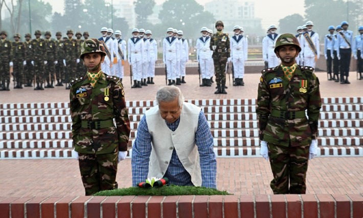 পুষ্পস্তবক অর্পণ শেষে ১৯৭১ সালের মহান মুক্তিযুদ্ধের বীর শহিদদের স্মৃতির প্রতি বিনম্র শ্রদ্ধা জানানোর জন্য সেখানে কিছুক্ষণ নীরবে দাঁড়িয়ে থাকেন প্রধান উপদেষ্টা। এ সময় বাংলাদেশ সেনাবাহিনী, নৌবাহিনী ও বিমান বাহিনীর চৌকস একটি দল সালাম জানায়।