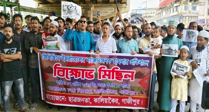 স্টাফ রিপোর্টার, গাজীপুর :: ফিলিস্তিনে ইসরায়েলি বাহিনীর নৃশংস হামলার প্রতিবাদে গাজীপুরের কালিয়াকৈর উপজেলার চন্দ্রা ত্রিমোড়ে আজ সোমবার (৭ এপ্রিল ) সকাল ১১টায় ছাত্র জনতার ব্যানারে এক বিক্ষোভ মিছিল অনুষ্ঠিত হয়। এ সময় পাঁচশতাদিক, শিক্ষার্থী, যুবক ও স্থানীয় জনগণ প্ল্যাকার্ড ও ব্যানার হাতে রাস্তায় নেমে আসেন।