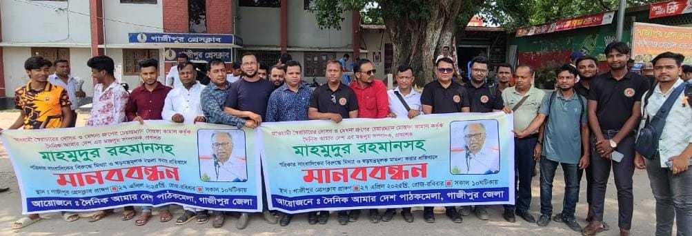 জুলফিকার আলী জুয়েল:- “মাহমুদুর রহমান যদি হেরে যান, হারাবে বাংলাদেশ; ভূলুণ্ঠিত হবে আমাদের স্বাধীনতা, মুছে যাবে আমাদের মানচিত্র”—এই মর্মস্পর্শী আহ্বানে গাজীপুরে অনুষ্ঠিত হলো আমার দেশ সম্পাদক মাহমুদুর রহমানের বিরুদ্ধে মিথ্যা মামলার প্রতিবাদে মানববন্ধন ও বিক্ষোভ সমাবেশ। রবিবার (২৭ এপ্রিল) গাজীপুর প্রেসক্লাব প্রাঙ্গণে আমার দেশ পাঠক মেলা গাজীপুর জেলা শাখার আয়োজনে এ সমাবেশে সভাপতিত্ব করেন পাঠক মেলার গাজীপুর শাখার সভাপতি ডা. আলী আকবর খান পলান। সমাবেশটি সঞ্চালনা করেন আমার দেশ পত্রিকার স্টাফ রিপোর্টার ও গাজীপুর প্রেসক্লাবের সাবেক সভাপতি নাসির আহমেদ। সমাবেশে বক্তব্য রাখেন গাজীপুর প্রেসক্লাবের সভাপতি মোস্তাফিজুর রহমান টিটু, সম্মিলিত পেশাজীবী পরিষদ গাজীপুরের সভাপতি অধ্যাপক নজরুল ইসলাম, হেফাজতে ইসলামের যুগ্ম সাধারণ সম্পাদক মুফতি নাসির উদ্দিন, মাওলানা হাবিবুর রহমান মিয়াজী, গাজীপুর প্রেসক্লাবের সিনিয়র সহসভাপতি এস এম দেলোয়ার হোসেন, সহসভাপতি মোঃ রেজাউল বারী বাবুল, সাধারণ সম্পাদক শাহ সামসুল হক রিপন, সাবেক সাধারণ সম্পাদক আমিনুল ইসলাম, সম্মিলিত পেশাজীবি পরিষদ গাজীপুরের সাধারণ সম্পাদক অধ্যাপক আসাদুজ্জামান আকাশ, কাপাসিয়া প্রেসক্লাবের সভাপতি, এফ এম কামাল হোসেন, কোনাবাড়ী থানা প্রেসক্লাবের সভাপতি, সালাউদ্দিন আহমেদ,কালীগঞ্জ রিপোর্টার্স ইউনিটির সাধারণ সম্পাদক মোঃ রফিকুল ইসলাম (রফিক), আমার দেশ শ্রীপুর প্রতিনিধি নুরুল আজিম বাবুল এবং পূবাইল প্রেসক্লাবের সভাপতি অ্যাডভোকেট আলতাব হোসেন প্রমুখ। বক্তারা বলেন, “মাহমুদুর রহমান শুধু একটি নাম নয়, তিনি এই দেশের ফ্যাসিবাদবিরোধী, সাম্রাজ্যবাদবিরোধী, আধিপত্যবিরোধী সংগ্রামের প্রতীক। তিনি আজ একাই একটি প্রতিষ্ঠান।” তারা দৃপ্ত কণ্ঠে উচ্চারণ করেন, “যে মানুষটি সত্য প্রকাশের অপরাধে জেল খেটেছেন, নিপীড়িত হয়েছেন, দেশ ছাড়তে বাধ্য হয়েছেন, তিনি আজও ষড়যন্ত্রের নিশানায়।” সমাবেশে বক্তারা জাতির উদ্দেশে প্রশ্ন ছুড়ে দেন— হাজার হাজার কোটি টাকা পাচারকারীদের বিরুদ্ধে মামলা হয় না কেন? বিচার ব্যবস্থাকে যারা নিজেদের ইচ্ছেমতো চালায়, তাদের কোনো জবাবদিহিতা নেই কেন? সত্য বলার অপরাধে মাহমুদুর রহমান কেন হয়রানির শিকার? তারা বলেন, “মাহমুদুর রহমান কোনো রাজনৈতিক দলের কর্মী নন; তিনি জনগণের পক্ষের, লুটপাটের বিরুদ্ধে এবং আধিপত্যবাদের মুখোশ উন্মোচনকারী এক সাহসী কণ্ঠস্বর। তার বিরুদ্ধে মামলা মানে—সত্য ও স্বাধীনতার বিরুদ্ধে মামলা।” সমাবেশ থেকে তিন দফা দাবি উত্থাপন করা হয়ঃ মাহমুদুর রহমানের বিরুদ্ধে দায়ের করা মিথ্যা মামলা অবিলম্বে প্রত্যাহার করতে হবে। ষড়যন্ত্রকারীদের চিহ্নিত করে জাতির সামনে উন্মোচিত করতে হবে। স
