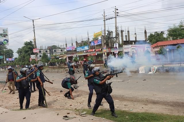 আন্দোলনকারী শিক্ষার্থীদের ছত্রভঙ্গ করতে পুলিশ রাবার বুলেট ও কাদাঁনে গ্যাসের সেল নিক্ষেপ করে। আজ মঙ্গলবার দুপুরেছবি: প্রথম আলো